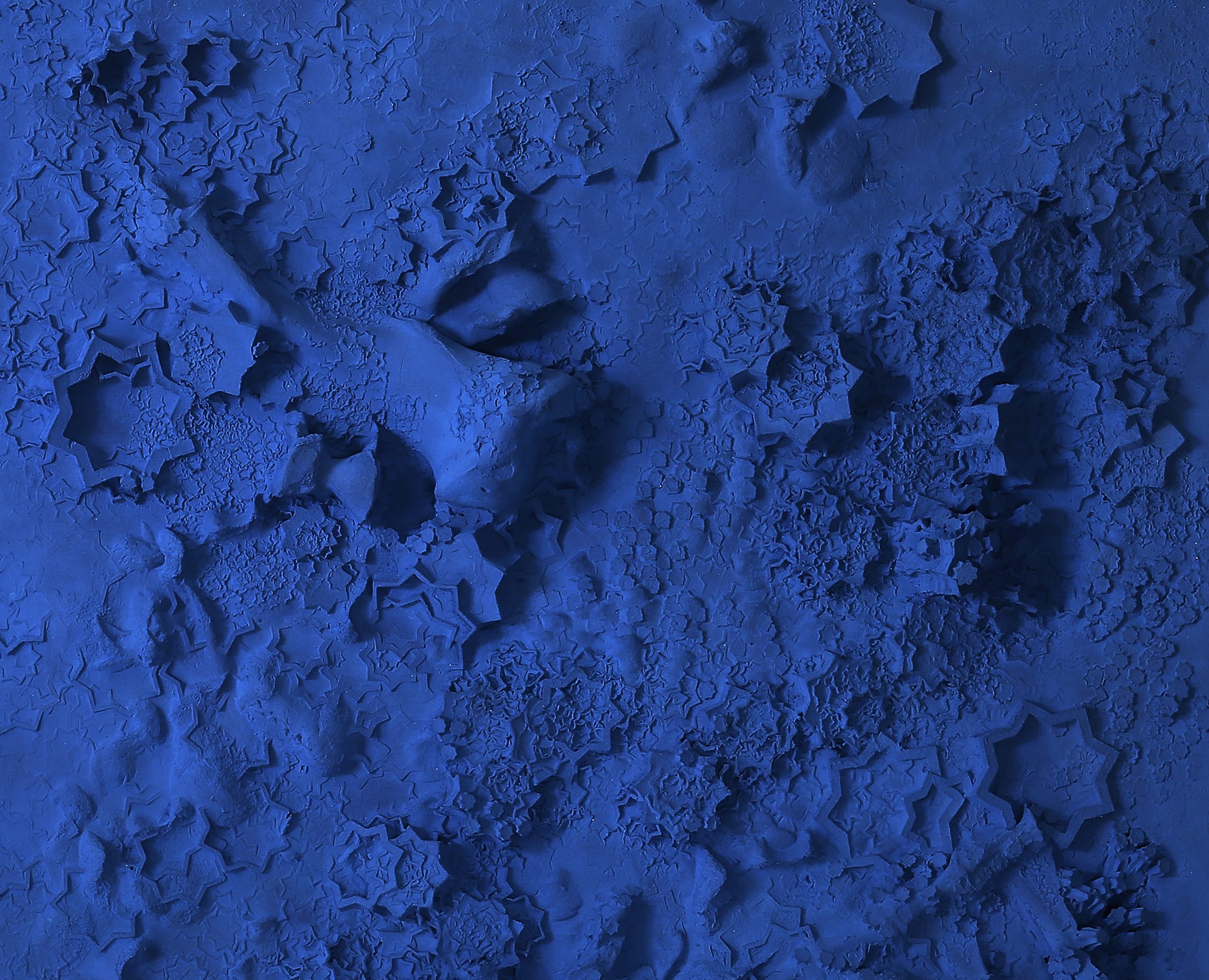Segue poi la riflessione estetica di Yasmina Alaoui, le cui composizioni realizzate con sale, sabbia, ghiaia o materiali acrilici si spingono verso un eclettismo grammaticale che esalta la dimensione poetica dell’esistenza. In una narrazione visionaria che si muove fra il visibile e il non visibile, l’artista si confronta con la vulnerabilità dell’essere umano, esplorando i confini fra figurazione e astrattismo, fra passato e presente, fra caos e ordine.