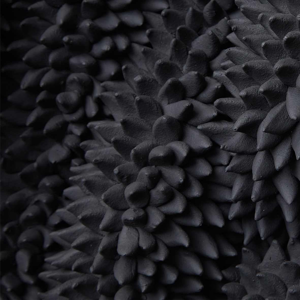 Le sculture di Andrés Anza appaiono astratte e figurative al tempo stesso. Se a prima vista sembrano delle masse informi, man mano che le si osserva si riconoscono figure, gesti e pose. L’artista si ispira alle forme del corpo umano, ai movimenti degli animali, alle silhouette della natura, infondendo tutti questi elementi in oggetti che ne conservano l’armonia. La fragilità della materia – argilla sottoposta inusualmente a una sola cottura – è protetta dagli aculei che ne ricoprono l’intera superficie, in un meccanismo di difesa/offesa che tiene in piedi gli equilibri tra l’opera e il suo fruitore.