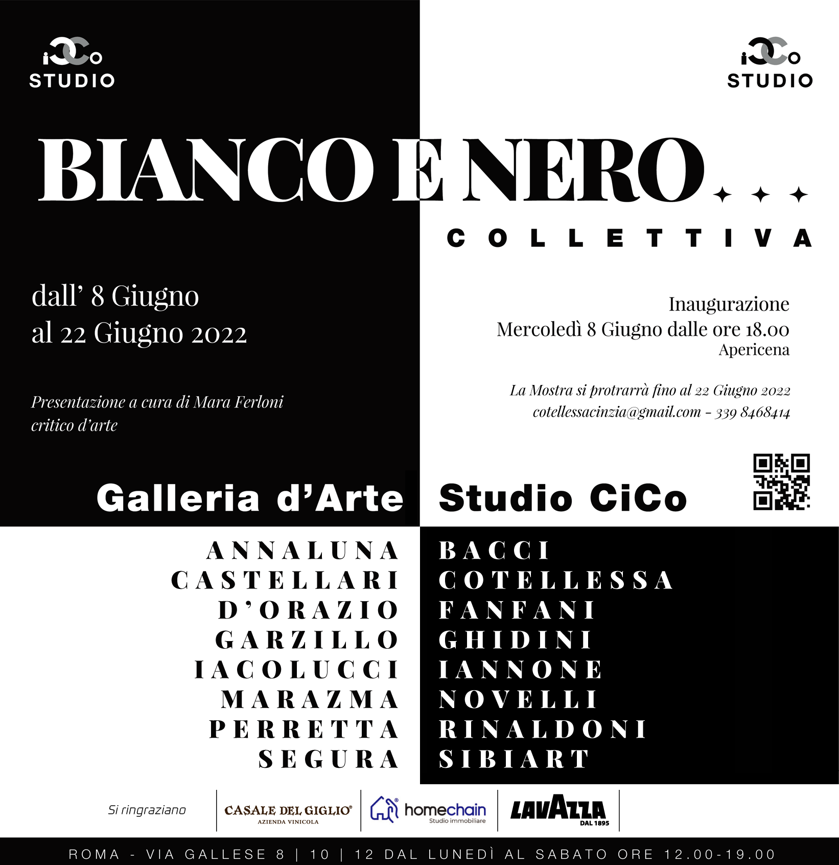 La Galleria Studio CiCo ha il piacere di presentare, mercoledì 8 giugno 2022, alle ore 18.00, la mostra collettiva di Arte Contemporanea, Bianco e Nero, sotto la direzione artistica dell’artista e curatrice, Cinzia Cotellessa. La presentazione sarà a cura di Mara Ferloni, critico d’Arte.
