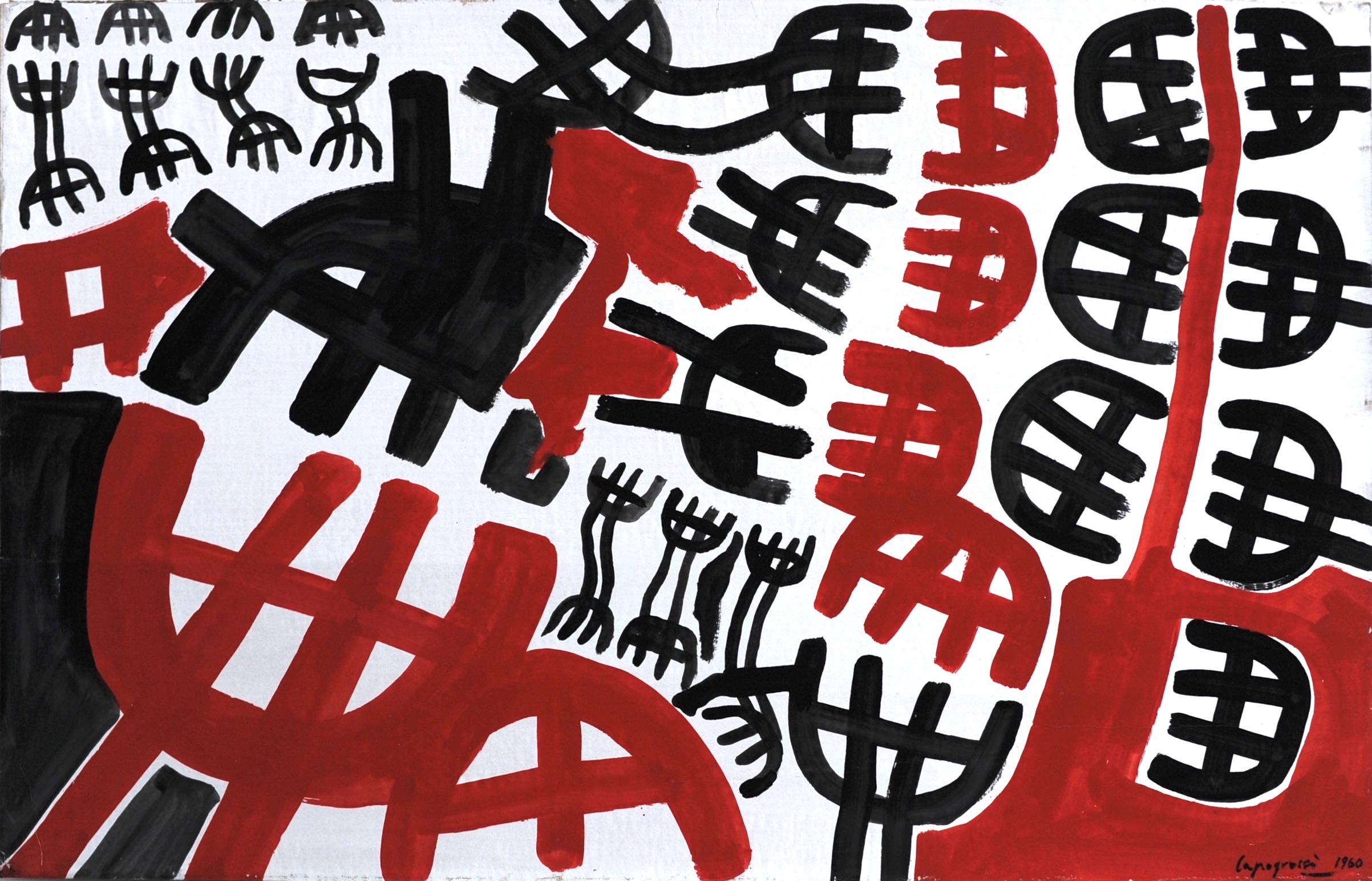 Da Roma, il segno dentato di Capogrossi, misterioso alfabeto di una lingua sconosciuta, approda con il suo strascico di dibattito critico prima alla galleria Il Milione di Milano, poi a Venezia alla galleria del Cavallino e alla Biennale e nei primi anni Cinquanta sulla scena artistica europea e americana giungendo all’attenzione della critica internazionale. “I singoli segni rimandano, soprattutto quando disposti in serie, ad alfabeti di lingue che non siamo in grado di interpretare, anche quando l’aspetto di ordine e sequenza è così forte da evocare la presenza di un significato”. (Roland Penrose, 1957)