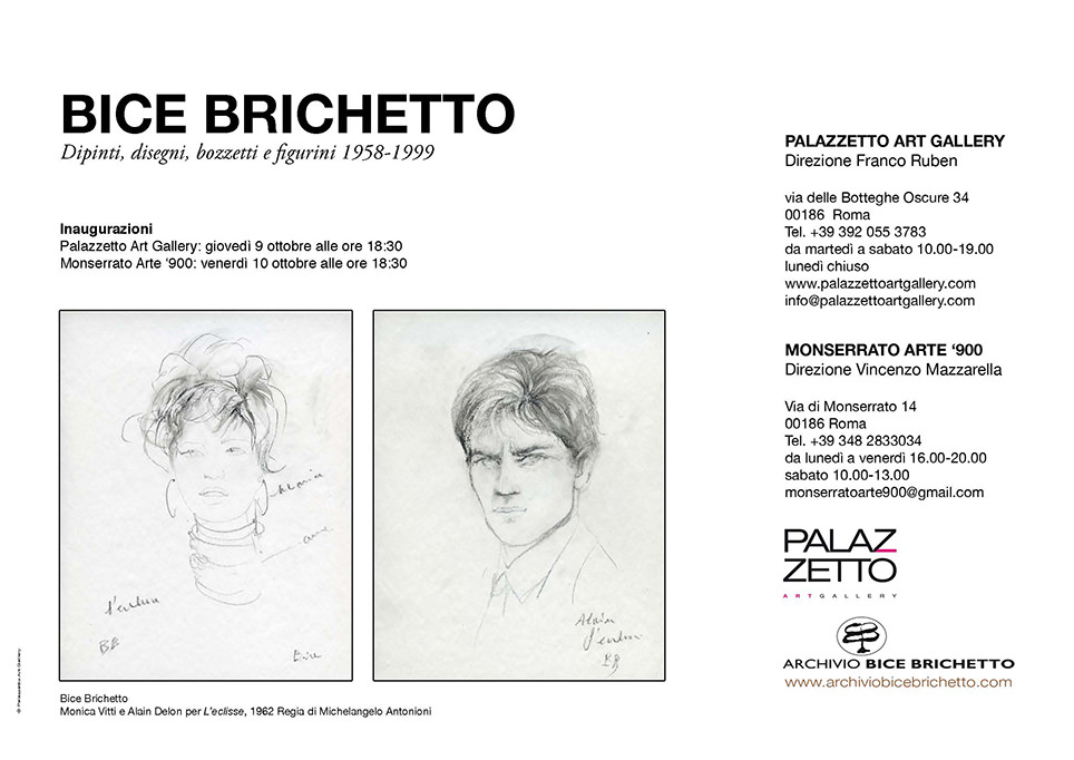 Palazzetto Art Gallery e Monserrato Arte ‘900 aprono le loro rispettive stagioni espositive con una mostra unica sulla pittrice, scenografa e costumista di fama internazionale Bice Brichetto (Milano 16 gennaio, 1926 – Orvieto 4 dicembre, 2012).