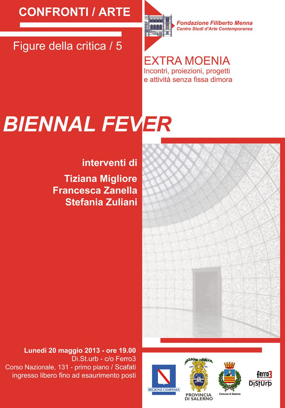 Anticipando di qualche giorno l’inaugurazione della 55. Biennale Arte di Venezia, la Fondazione Menna vuole proporre un momento di confronto attorno a questi problemi a partire proprio dall’analisi della storica biennale veneziana e delle sue trasformazioni. A discuterne saranno Tiziana Migliore (Università Ca Foscari, Venezia) semiologa, che ha da poco pubblicato il volume Biennale di Venezia Il catalogo è questo (Roma, 2013), Francesca Zanella (Università di Parma), docente di Storia e teorie dell’esposizioni e degli allestimenti e autrice del saggio Esporsi. Architetti, artisti e critici a confronto in Italia negli anni Settanta (Verona, 2012) e Stefania Zuliani (Università di Salerno), docente di Teoria della critica d’arte e autrice del saggio Esposizioni. Emergenze della critica d’arte (Milano, 2012).