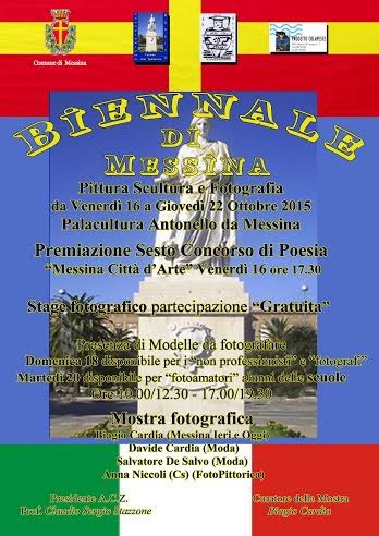 Venerdì 16 Ottobre sarà presentata la Biennale di Messina presso il Pala-Cultura “Antonello da Messina”, evento speciale che da anni viene organizzato nella nostra città dall’artista messinese Biagio Cardia il quale si è avvalso della collaborazione del Direttivo “Accademia Culturale Zanclea”, l’Associazione “Progetto Colapesce” diretta dall’Avv. Giuseppe Santalco e “Association of Italian American Educators”. E’una importante manifestazione attesa con grande interesse non solo dagli artisti partecipanti ma anche dai numerosi visitatori che già conoscono l’evento di livello Internazionale. Alla Biennale, anche quest’anno viene abbinata la Sesta Edizione del Concorso di Poesia Internazionale “Premio Messina Città D’Arte”, curato da un Comitato di intellettuali messinesi composto dal Presidente Prof. Claudio Sergio Stazzone, delle dott.sse Agata Midiri, Celestina Matino, Giovanna Lo Giudice, Ketty Millegro e Tiziana Midiri. La Premiazione avrà luogo Venerdì 16 Ottobre ore 17.30, con la presenza dell’Assessore alla Cultura Prof. Tonino Perna. Contestualmente all’esposizione delle opere pittoriche che sarà possibile visitare fino al 22 Ottobre, si terrà una Mostra fotografica di Artisti professionisti e uno “Stage Fotografico” con la presenza di modelle, nei seguenti giorni; Domenica 18 per i fotoamatori e fotografi, Martedì 20 per gli alunni delle scuole di Messina. Alla mostra fotografica saranno presenti gli artisti: Biagio Cardia che esporrà foto di “Messina ieri e oggi”; Salvatore Desalvo (Moda); Davide Cardia (Moda) Anna Maria Niccoli di Cosenza (fotopittoriche). Per il Premio di Poesia, è prevista la partecipazione di poeti Europei ed Exstraeuropei. Allieteranno la serata i cantori messinesi Gianni Argurio e Mimmo Ambriano.