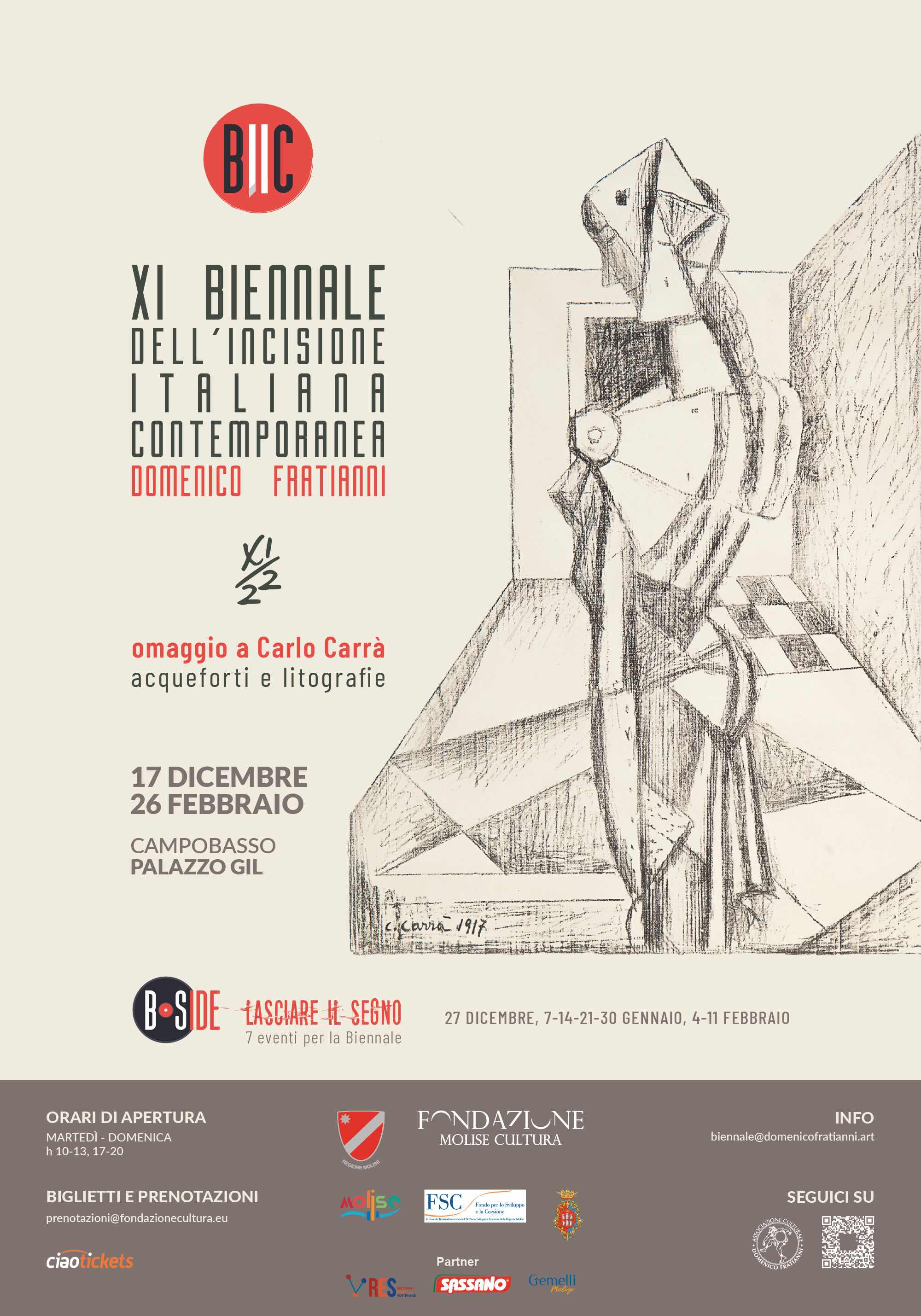Questa eccezionale presenza è motivo di orgoglio della BIIC, ancora una volta capace di mettere in dialogo gli artisti viventi con i grandi artisti del passato. Insieme a Carrà, la XI Edizione della BIIC esporrà 116 opere di 58 artisti invitati: la Commissione scientifica ha selezionato alcuni tra i maggiori esponenti dell’incisione italiana contemporanea, tra i quali vi è un gruppo di 8 giovani incisori individuati nelle diverse Accademie di Belle Arti nazionali, a testimonianza che la BIIC è particolarmente sensibile alle giovani generazioni di artisti. Ogni partecipante esporrà due opere, per un totale di ca. 110 opere allestite. Per il suo fondatore, il Maestro Domenico Fratianni, la Biennale doveva essere parte di “un’operazione culturale capace di coinvolgere tutti coloro che amano il richiamo dell’Arte” portandoli in Molise, una terra considerata come un “anello di congiunzione tra il Mezzogiorno d’Italia” e il resto del Paese e capace di proiettarsi anche in uno scenario internazionale. Sono degli obiettivi che il Maestro fissò in un testo-manifesto e che, pur fra mille difficoltà, sono stati raggiunti nelle dieci edizioni passate: per esempio, ospitando artisti di Paesi di grande vivacità artistica come la Francia, la Slovenia o la Spagna... Domenico Fratianni, che in gioventù era stato anche docente, ha sempre pensato alla Biennale come ad un elemento di stimolo per il mondo studentesco, in relazione con l’Università del Molise, i Licei artistici e l’Istituto d’Arte. Anche questa edizione vede imprescindibile la figura del curatore Floriano De Santi è critico e storico dell’arte. Il suo lavoro ermeneutico, orientato sull’arte moderna e contemporanea, ma anche aperto sul passato, traduce in una scrittura fertile ed immaginosa una sensibilità ed una conoscenza diretta così delle poetiche come dei dati linguistici e tecnici. Ne fa fede una dichiarazione di Giulio Carlo Argan: “De Santi è tra gli studiosi europei più impegnati e rigorosi della sua generazione”.