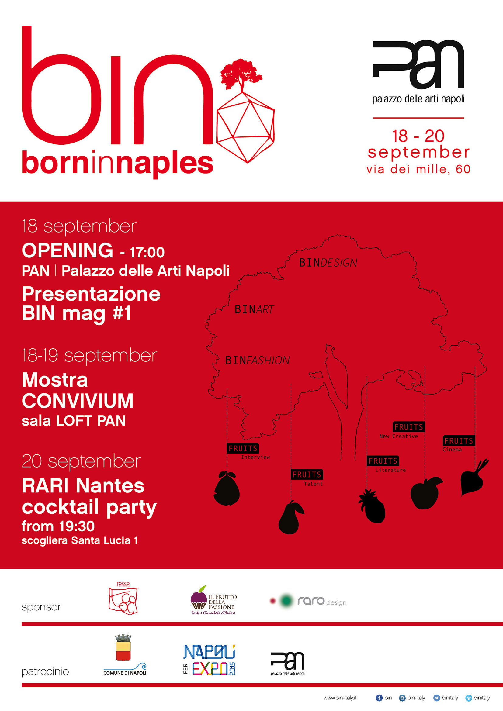 bin-Born In Naples è una piattaforma “glocale” sulle comunità creative tra design, arte e moda, che analizza nuovi scenari della cultura contemporanea del made in italy partendo dal sud della nostra penisola e che affonda le radici di un robusto albero a Napoli. Correnti nate a Napoli come luogo di passaggio e scambio di culture mediterranee ed internazionali dove nascono nuove linee contemporanee nell’arte, passando dai nuovi scenari del mondo cinematografico e teatrale o musicale. Comunità creative che dimostrano un’intelligenza “unica” che si diffonde facilmente nel resto del globo grazie alle particolari capacità sperimentali nell’esprimere i diversi generi di un gusto esclusivamente made in italy. Le peculiarità del portale sono quelle di diffondere profili ed attività di designers, artisti, fashion designers, sound designers, etc, in una piattaforma che attraverso la rete possa fornire una visibilità internazionale alle diverse professionalità connesse al progetto bin, cha anche attraverso la sezione bin_events si occupa di diffondere le culture del design, della moda e dell’arte contemporanea nei suoi vari generi, mediante la partecipazione a fiere ed eventi internazionali di settore, partita con l’attività di RARO design nel 2002. Nel curriculum di bin si annovera la partecipazione ad eventi durante il Salone internazionale del Mobile di Milano, 2012, e 2015, un evento Fuori Fiera del Mobile di Napoli, la partecipazione al Genio delle Due Sicilie durante la Parigi Design Week , Maison Object di settembre 2012, la collaborazione con il Global Village dello Iacocca Institute della Lehigh University P.E. Usa, la cooperazione al Giffoni Innovation HUB e Planet-Y Doha-Giffoni dal 2014 e 2015. A settembre 2015 nasce la platzine quadrimestrale bin_mag – piattaforma/magazine online, con l’intento di valorizzare ancor più i talenti creativi che cooperano all’interno della piattaforma bin.