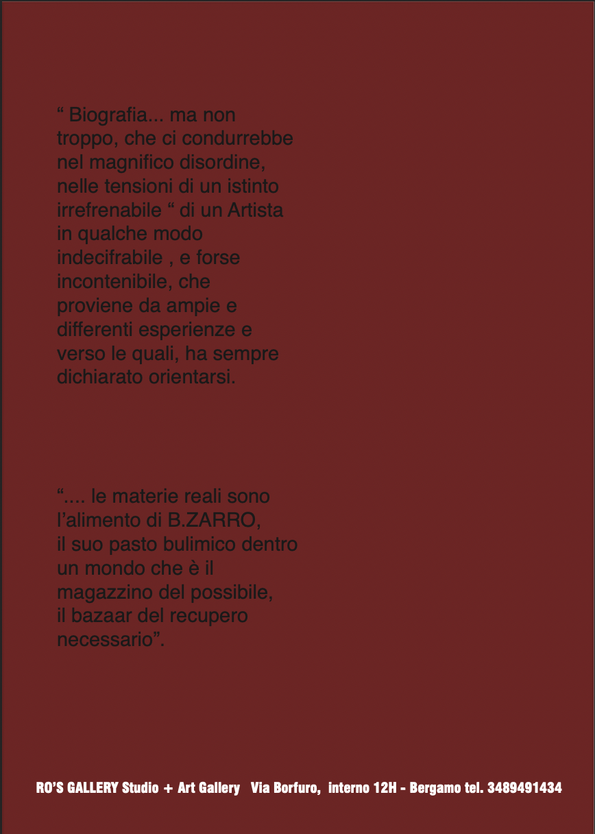 E proprio secondo questa logica le sue “Grafie” sono poesie, racconti delle proprie esperienze e pensieri “sulle cose del Mondo”, che l’Artista ha scritto in diverse fasi della vita, le quali diventano canzoni rilette in chiave contemporanea e se associate ad alcune Opere possono diventare l’una il proseguimento dell’altra. B.ZARRO questa volta sceglie lo spazio e l’intuito di Rossana Pedrali per avviare un’ulteriore sviluppo della sua creatività che comprende anche oggetti di Design, arredo e progettazione di ambienti, mettendo a frutto le proprie esperienze nel campo dell’Architettura Sensibile. In tale ambito è stato definito da uno dei massimi esponenti di tale disciplina, l’Architetto Helio Piñon, già titolare della cattedra di Architettura Sensibile dell’Università di Barcellona, come uno dei maggiori talenti che gli è capitato di incontrare... “Non mi considero un indovino, ma di solito riconosco il talento di chi opera con criteri artistici, per quanto breve possa essere la sua manifestazione: quello che ho visto di B. ZARRO mi è bastato per individuare in lui un senso della forma non comune, anche tra coloro che si considerano artisti. L'arte di B.ZARRO è trasparente, dirà qualche frettoloso: basta uno sguardo per cogliere il suo "discorso", secondo chi non riconosce all'arte altra dimensione che quella comunicativa.”