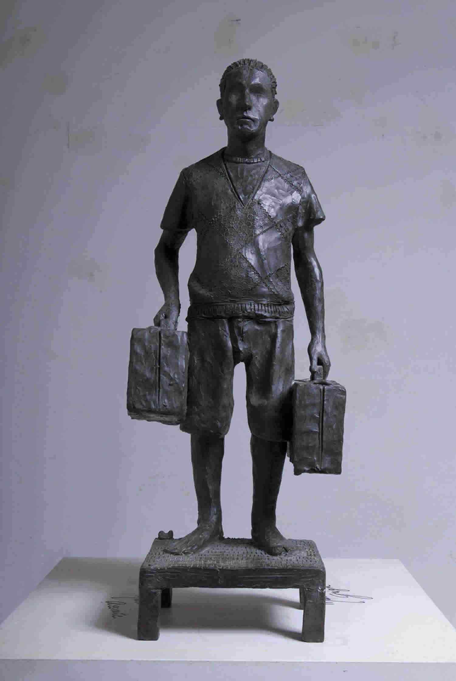 NICOLA BIONDANI: Hanno due anime le sculture di Nicola Biondani. Una è quella classica, intrisa di storia, figlia di Medardo Rosso e Marino Marini. L’altra è quella modernissima, densa di allusioni alle trame complesse del vivere contemporaneo, all’incomunicabilità, alla fatica dell’esistere, a una serpeggiante sfiducia nel futuro. Due anime che si specchiano nel gioco di contrappunti tra la monumentalità intrinseca anche ai lavori più piccoli e l’umanissimo tremore dello sguardo; tra la postura totemica – quasi di idoli contemporanei – dei soggetti e il loro essere presi in attività minime e quotidiane. Sono viaggiatori persi per le vie del mondo. A volte siedono esausti sulle proprie valigie, altre volte sembrano appena scappati da qualche situazione insostenibile, qualche volta indossano un piumino invernale come un’armatura che possa proteggerli dal mondo. - Nasce nel 1976 a Mantova. Dopo essersi diplomato nel 1998 all’istituto d’Arte di Guidizzolo (MN) come Maestro d’Arte, nel 2004 si laurea con il massimo dei voti all’Accademia C.B. Cignaroli di Verona. Nello stesso anno apre uno studio personale nel centro di Mantova e lavora come scultore scenografo presso l’Ente lirico Veronese. Realizza numerose mostre e partecipa a fiere e concorsi in Italia. Vive e lavora tra Milano e Pietrasanta.