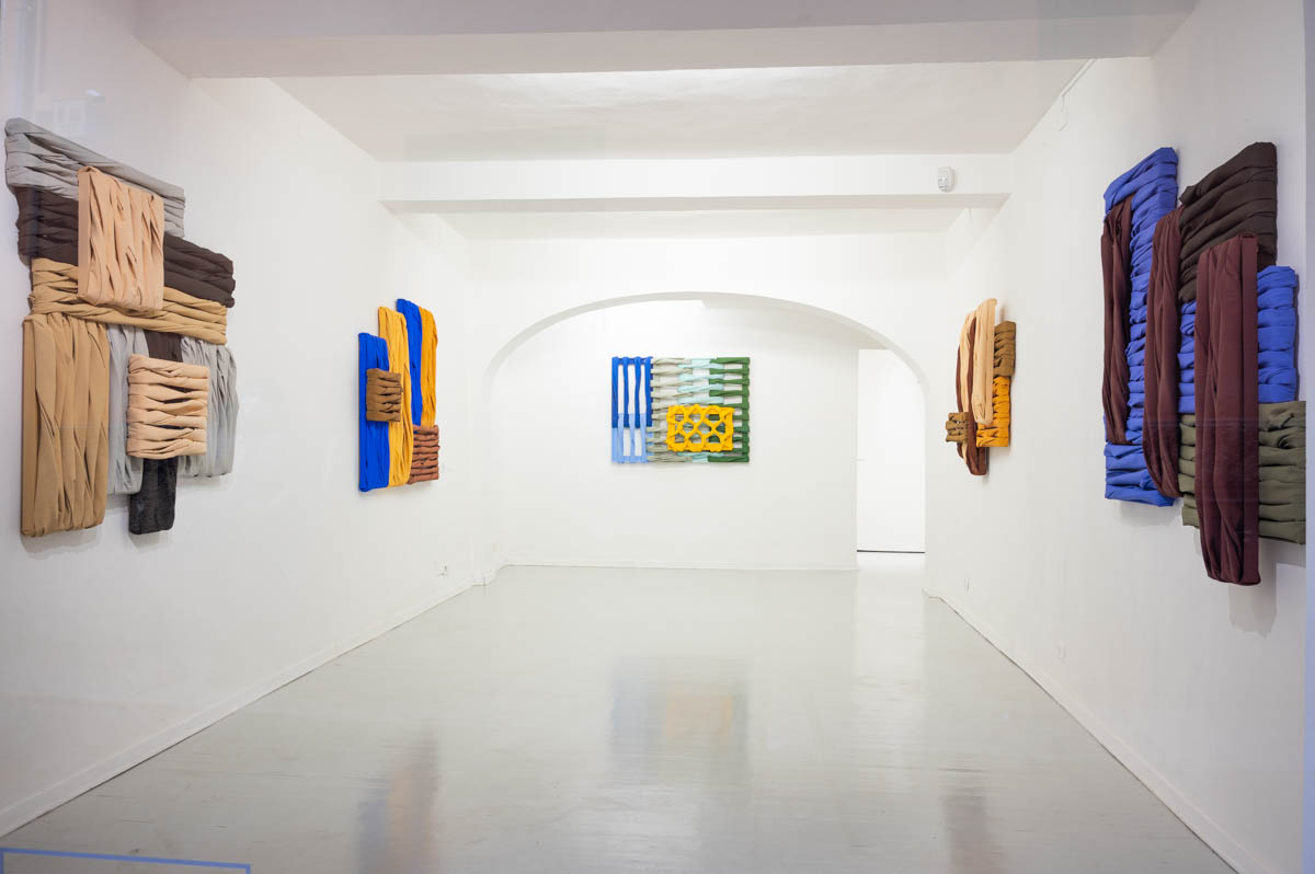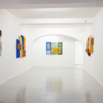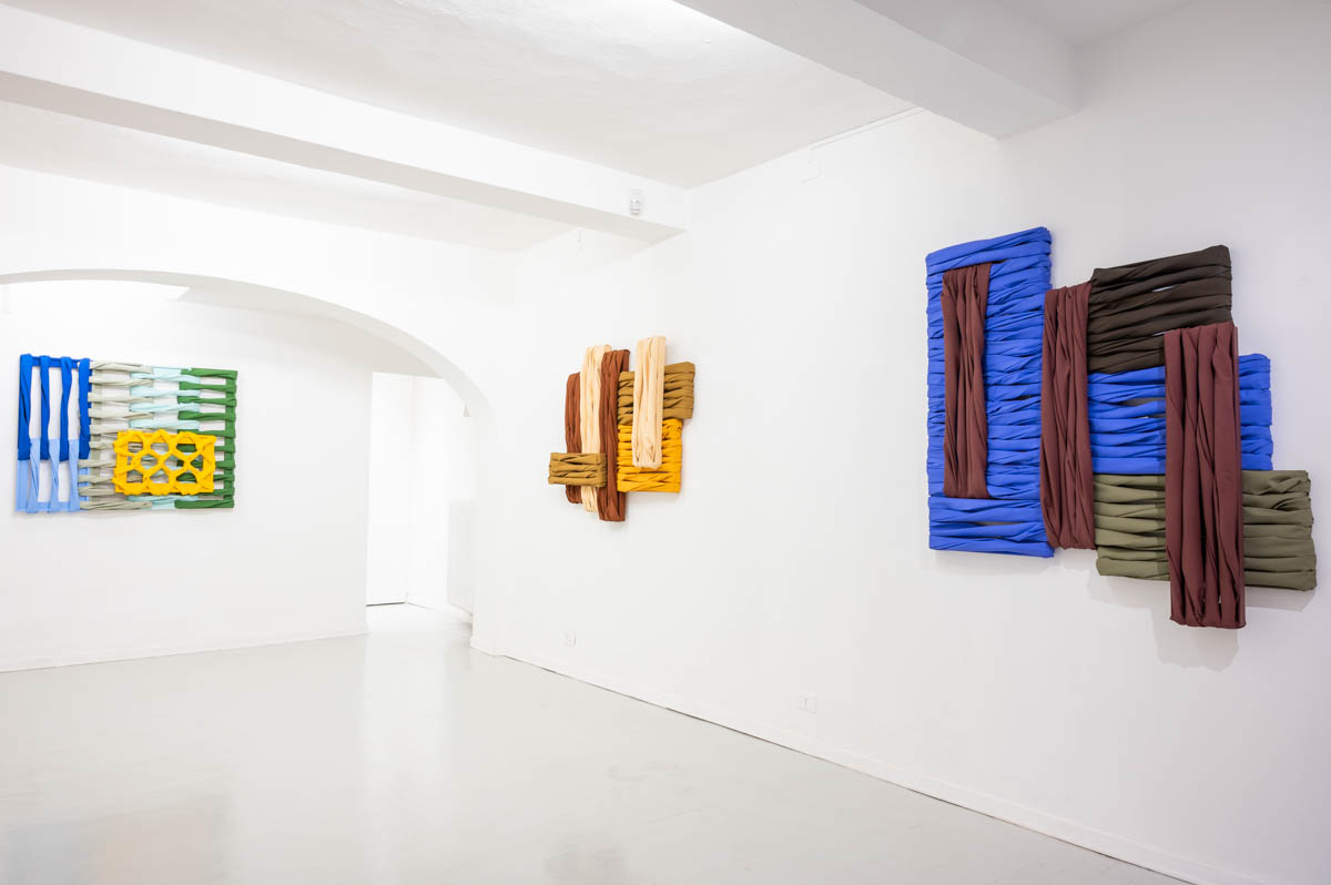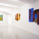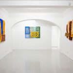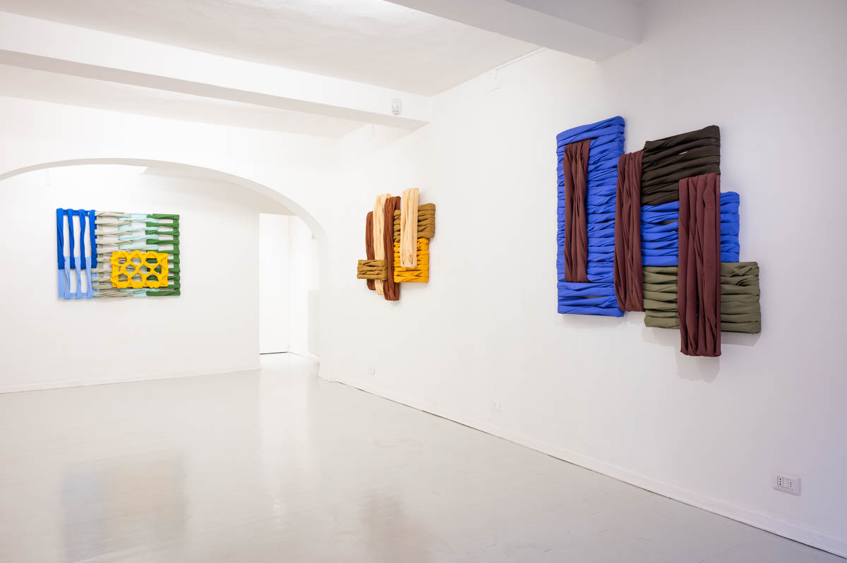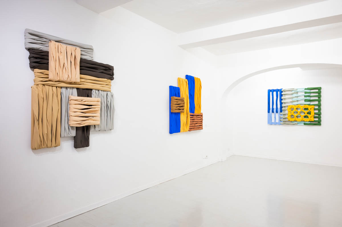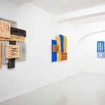 Le opere in mostra sono parte della serie in corso Wall of Canvas, con cui l’artista sonda le possibilità fisiche e formali della pittura a partire da personali modalità di utilizzo dei suoi elementi principali: tela, telaio e colore. La tela viene convertita da supporto pittorico in elemento strutturale, e insieme al telaio dona ai dipinti caratteristiche architettoniche. Nella combinazione verticale e orizzontale delle tele che riecheggia le disposizioni dei mattoni nelle tecniche edilizie, prende forma una vera e propria superficie muraria. La pittura si trasforma in un gesto di costruzione, e relazionandosi con lo spazio le opere tendono verso un’ibridazione al limite tra funzionalità e decorazione parietale.