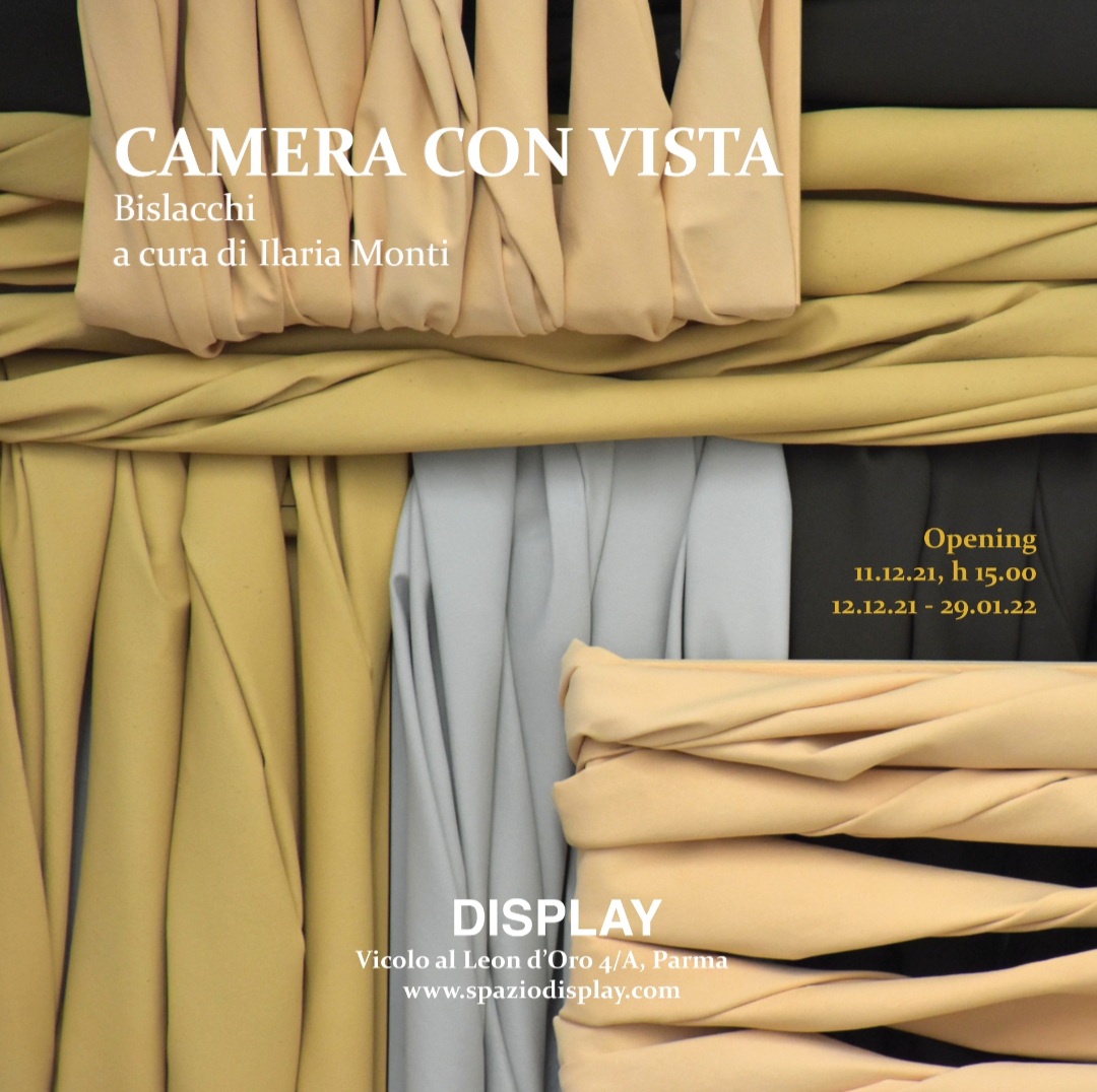 Camera con vista è un non luogo, come per Zygmunt Bauman erano tutte le stanze d’albergo: luoghi di transito, nostri solo per il tempo che serve, con le finestre su città in cui siamo di passaggio. Della sua visita a Parma Bislacchi ricorda i colori della facciata del Duomo e della pittura di Correggio. Le opere Duomo e Di Correggio mi ricordo un muro, appositamente realizzate per DISPLAY, sono il risultato di un processo di sintesi e astrazione delle immagini. Intrecciando le tele dipinte al telaio, l’artista crea un’alternanza di vuoti e superfici che dialogano con lo spazio e con il tempo: