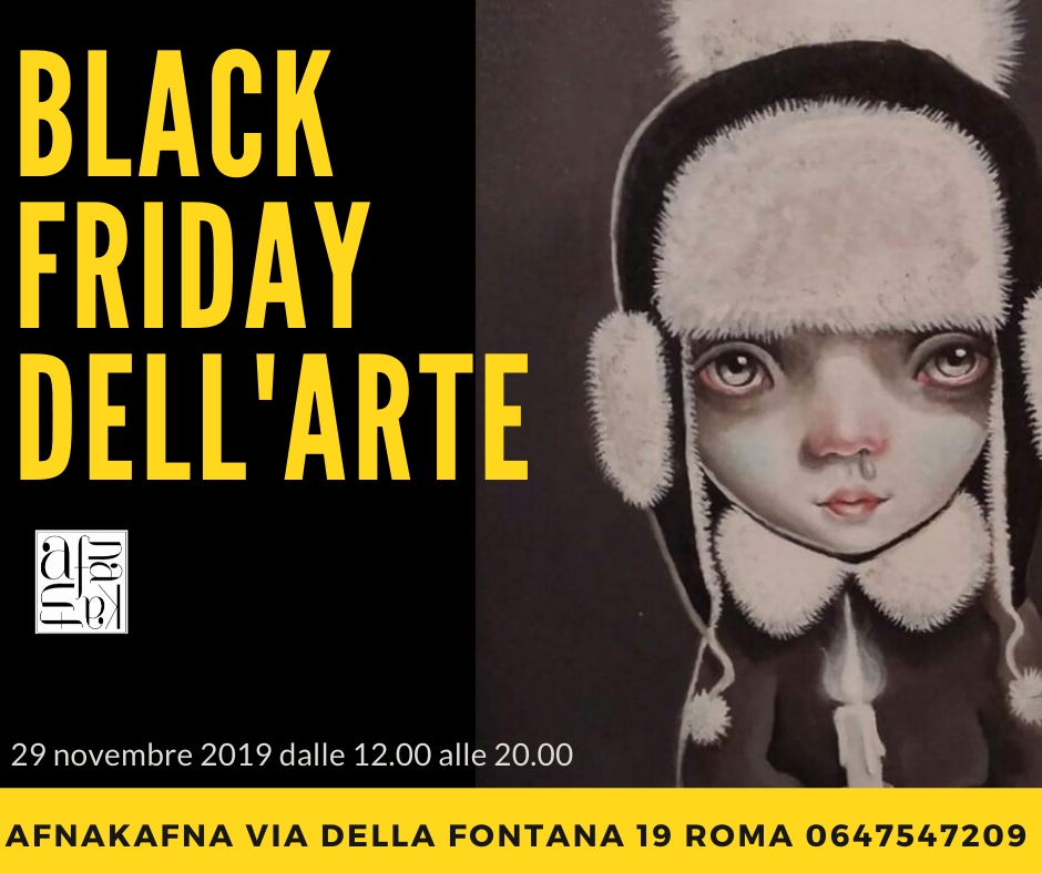 La galleria Afnakafna pensa al Black Friday dell’Arte come occasione per avvicinare un nuovo pubblico, quello un po’ intimorito dalle gallerie d’arte, che in questo modo potrà scoprire quanto sia bello e gratificante diventare il proprietario di un’opera d’arte unica ed esclusiva. In orario di apertura, dalle 12.00 alle 20.00, in mostra opere su tela, ceramiche, di piccole e grandi dimensioni offerte in sconto. La vendita proseguirà dalle 20.00 alle 00.00 sul portale Artsy.net