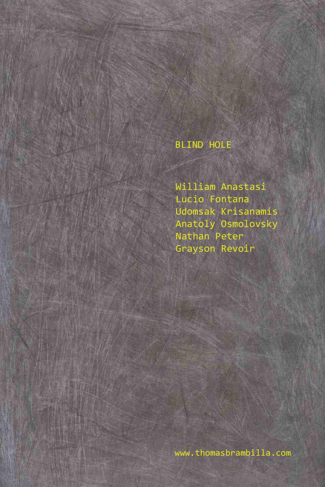 La galleria Thomas Brambilla è lieta di annunciare per Sabato 31 Marzo 2012 l’inaugurazione della mostra collettiva Blind hole, con William Anastasi, Lucio Fontana, Udomsak Krisanamis, Anatoly Osmolovsky, Nathan Peter, Grayson Revoir.