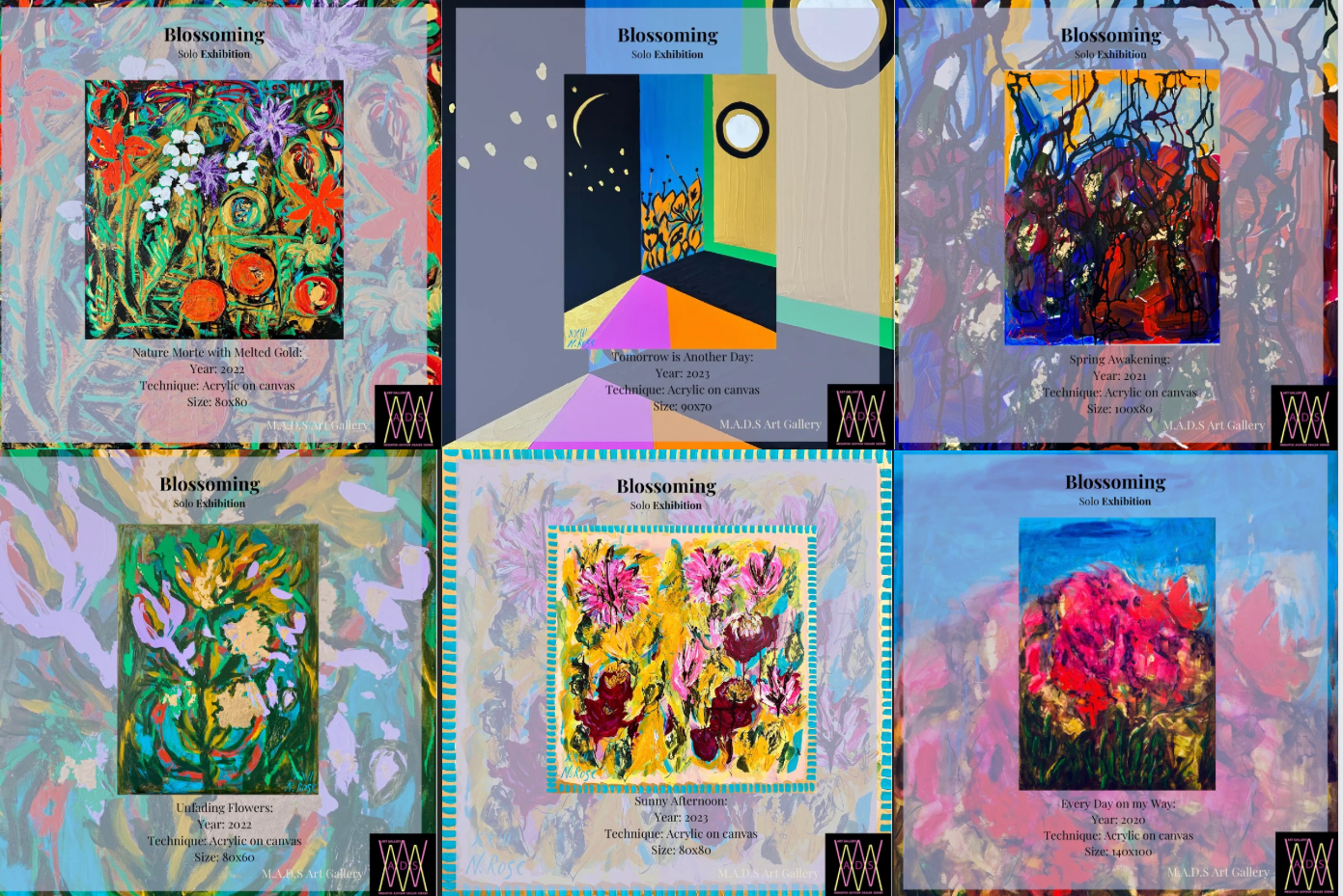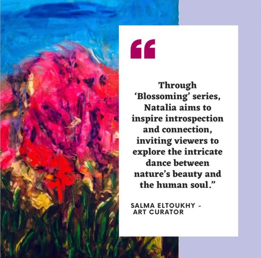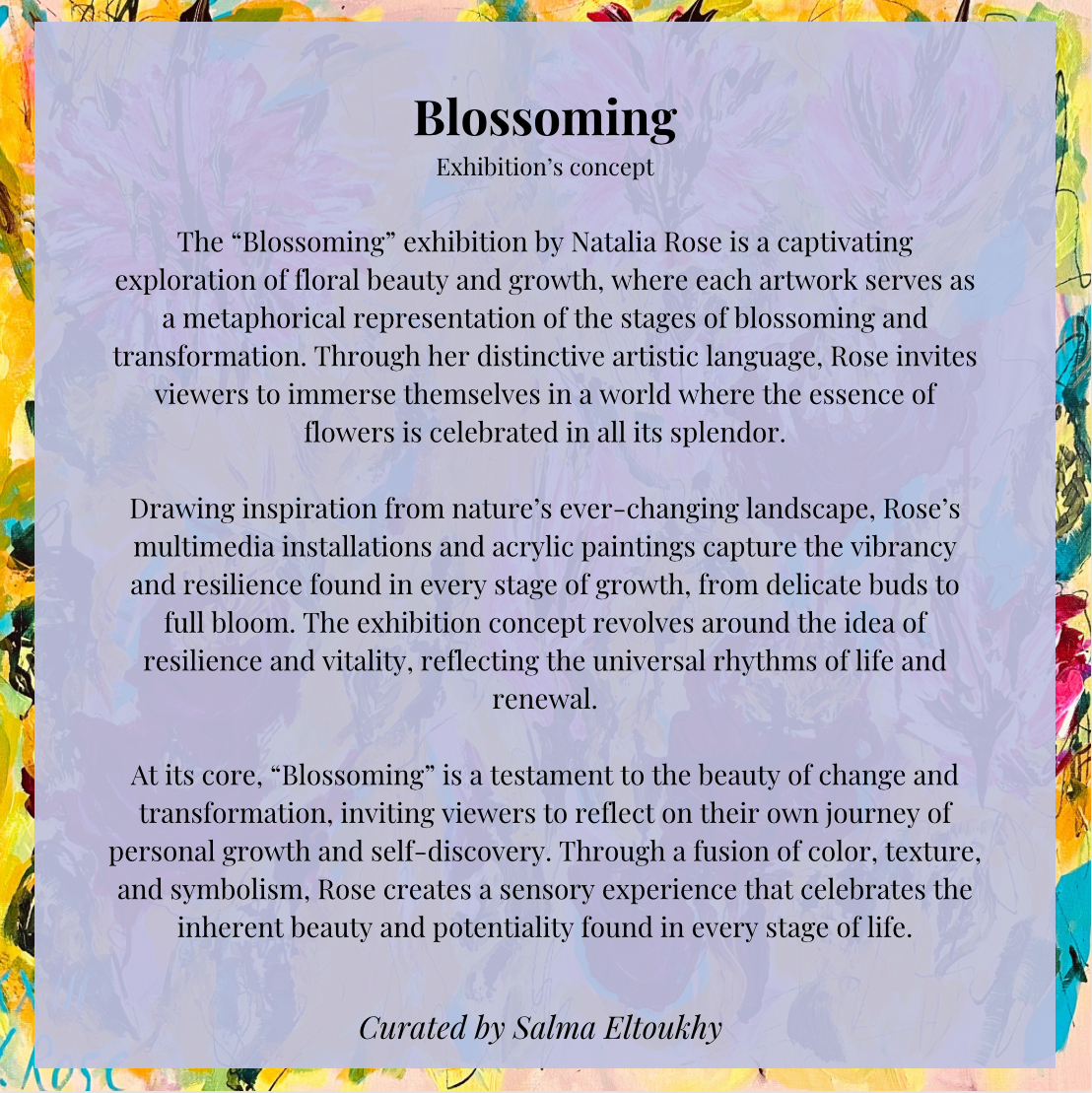 “Blossoming” solo exhibition of Natalia Rose curated by Salma Eltoukhy showcases a stunning journey through floral beauty and transformation. The paintings capturing the vibrancy and resilience of flowers at every growth stage, celebrating celebrating life’s renewal represented by spring.
