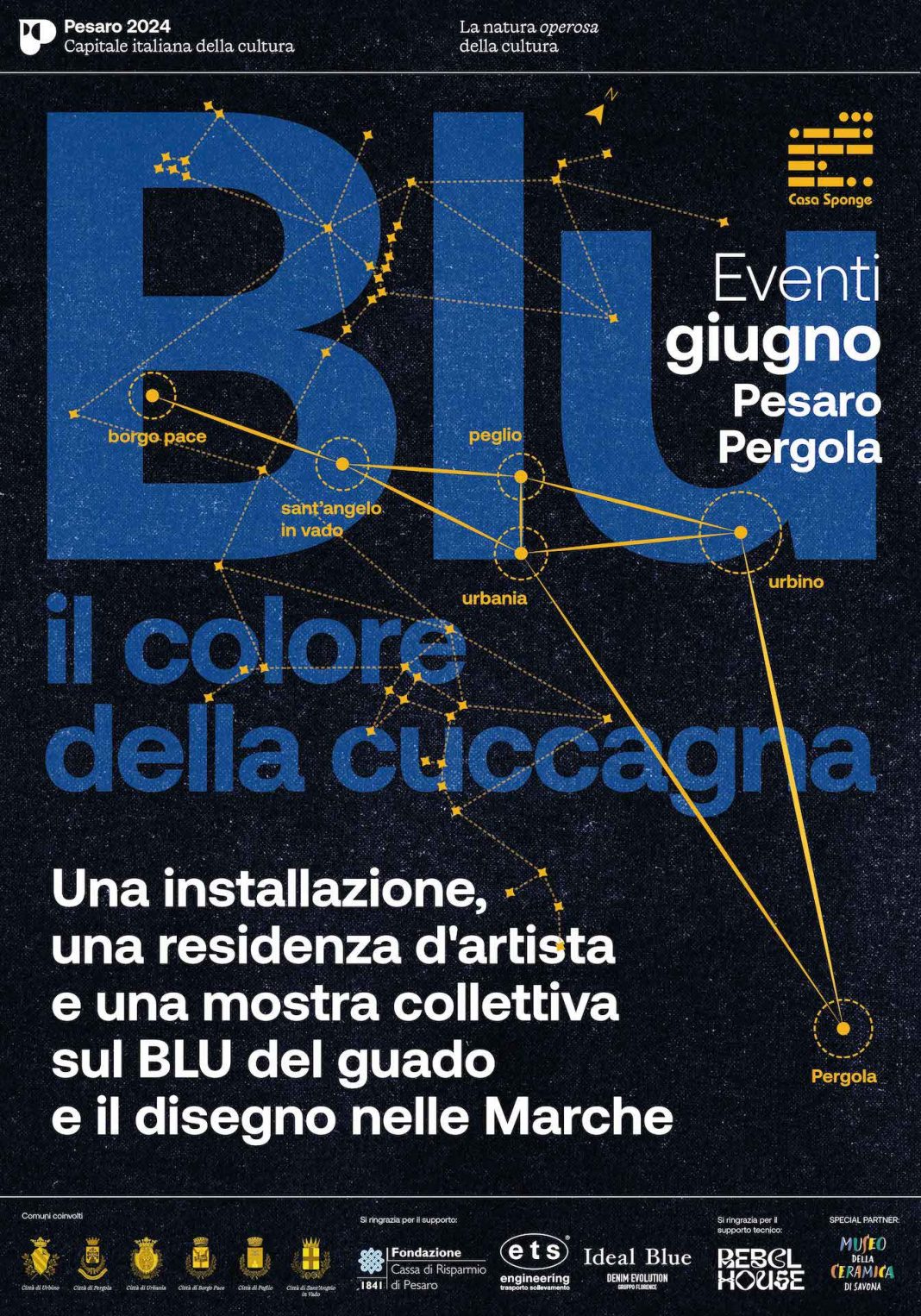 ‘Blu: il colore della cuccagna’ è costruito attorno al tema del blu con un preciso riferimento alla pianta Isatis tinctoria tipica dell’area conosciuta come ‘guado’. Collocato nella sezione della ‘natura operosa’ della cultura, il progetto attribuisce a questa tinta un inestimabile valore, sottolineando il suo profondo legame storico con l'ambito dell'arte. Vi è inoltre riflessa la nascita di un ‘distretto produttivo’ ante litteram, in cui l'arte si fonde con l'agricoltura, la biologia, la chimica e l'economia, dando vita a una sorta di autentica ‘Natura della Cultura’ perfettamente in linea con Pesaro 2024. Partner i comuni di: Pergola, Urbania, Urbino, Borgo Pace, Peglio e Sant’Angelo in Vado.