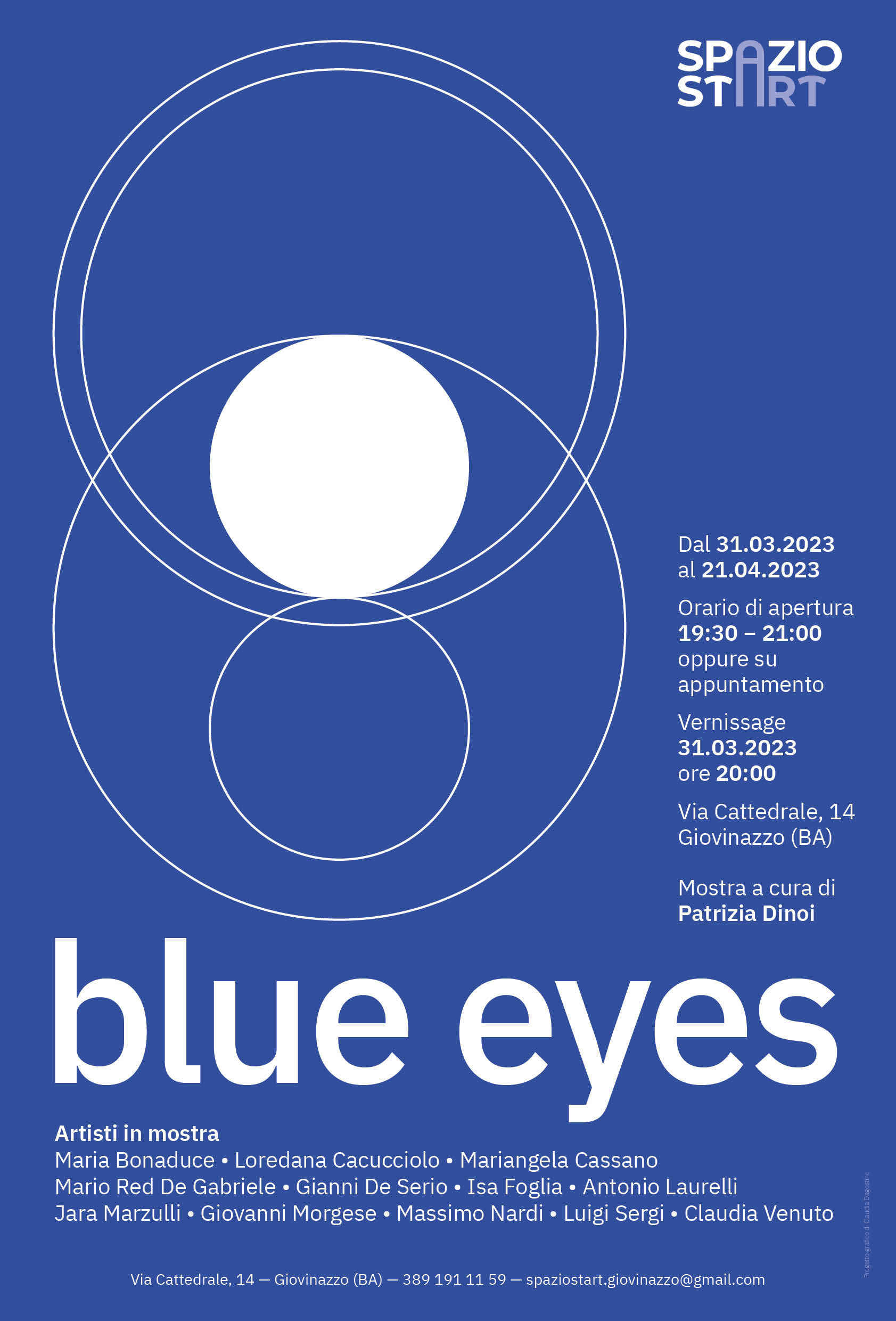 In Blu eyes , mostra con cui Spazio Start riparte nella primavera 2023, sono esposte opere in cui il blu è il colore prevalente. Molti amano il blu perché è il colore del cielo e del mare, perché trasmette una sensazione di grande libertà propria del dispiegarsi di spazi infiniti. I Romani, tuttavia, associavano il blu ai barbari poiché i soldati celti si tingevano il corpo di blu prima di andare in battaglia. In epoca paleocristiana il blu era accostato al lutto e alla sfortuna. Nel XII secolo è diventato il colore del manto della Vergine Maria e pertanto scelto come sfondo in molti stemmi nobiliari. È stato un colore molto amato da Van Gogh, Monet, Cézanne e da Picasso.