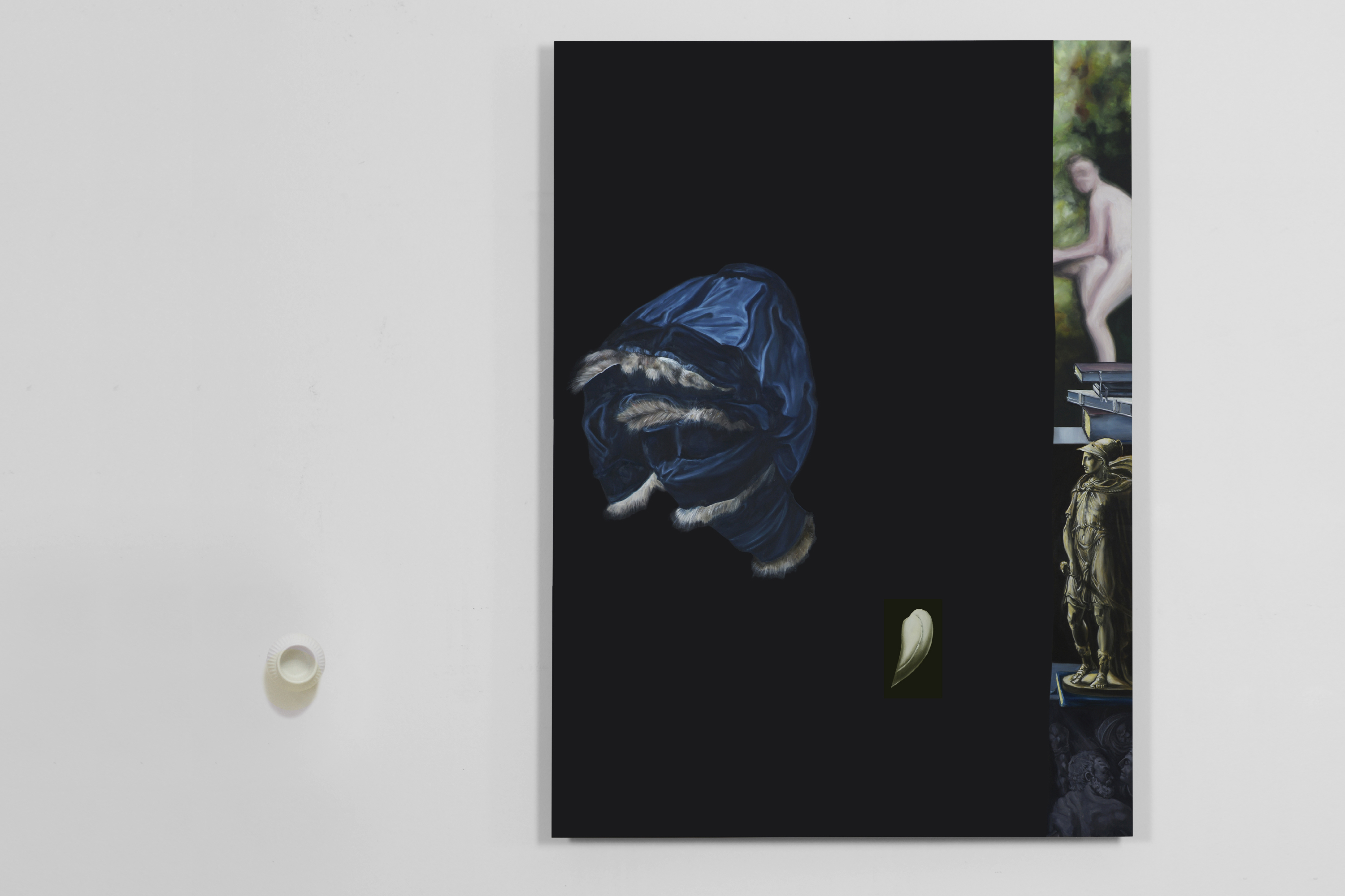 Hadal Zone si rifà agli abissi marini, ai crepacci profondi che si aprono nel cuore degli oceani da sei a undicimila metri di profondità. Qui la luce non può contrastare l’oscurità regina. La stessa riempie il fondo dei dipinti, squarciati da panneggi di maniche a sbuffo, scampoli architettonici e spiragli nascosti. Ogni quadro presente si pone come un ecosistema a sé stante che coabita con gli altri sulla base di un delicato equilibrio fatto di accordi cromatici e compositivi. Personaggi senza volto entrano in relazione con lo spettatore creando un dialogo silente, aperto e condiviso; quasi a diventarne l’alter ego, avvolti in quel buio che non vuole annientare la terza dimensione, bensì mostrarla.