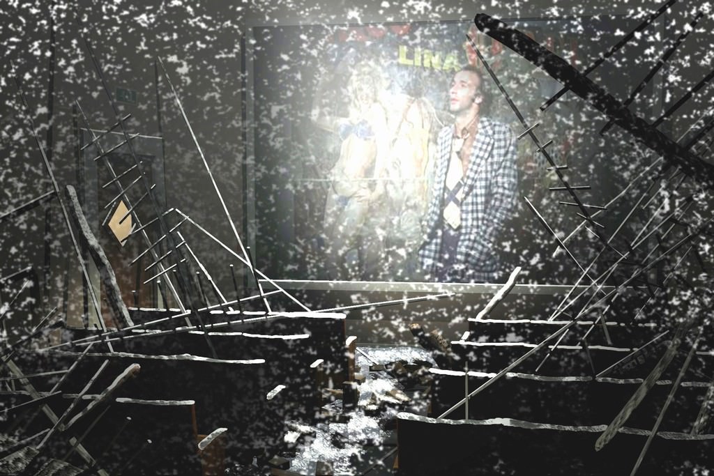L’idea di allestimento, vista la morfologia del luogo (molte pareti dal colore neutro ben adattabili a divenire superfici sulle quali proiettare immagini), è quella di operare una sorta di generale ridefinizione decorativa virtuale del palazzo, coprendo soffitti e pareti con proiezioni di immagini soprattutto in movimento, frammenti audiovisivi (cinematografici e televisivi) attraverso i quali realizzare la nostra narrazione-esposizione, tenendo conto della partitura di spazi spesso circoscritti da stucchi e cornici, dentro le quali adatteremo i nostri filmati.