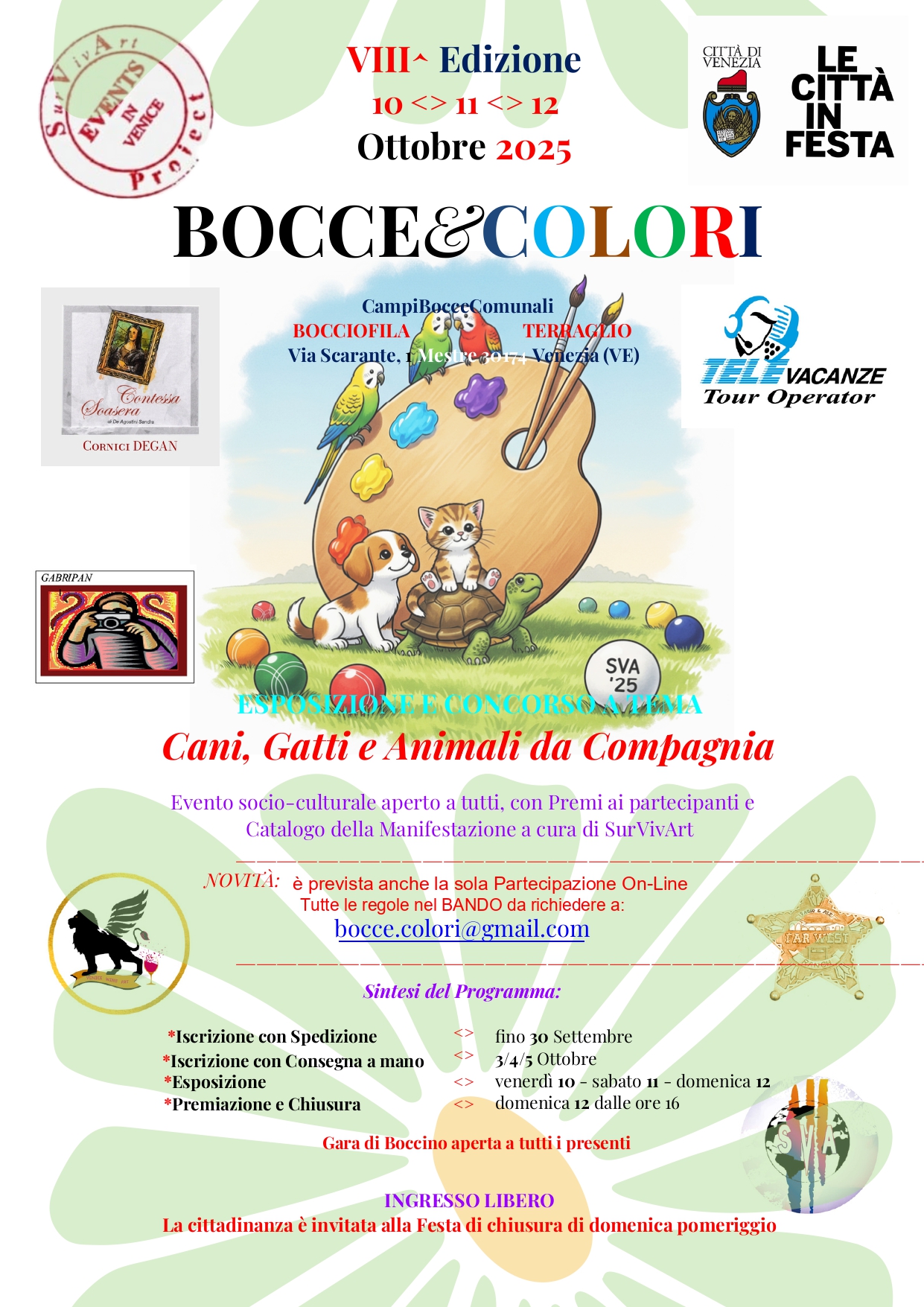 COMUNICATO STAMPA “Bocce & Colori”: a Mestre l’arte incontra lo sport per l’VIII edizione dell’Incontro Espositivo. La Società Bocciofila Terraglio è lieta di annunciare l'ottava edizione dell'Incontro Espositivo “Bocce & Colori”, un evento socio-culturale che unisce arte e sport in un'atmosfera unica e aperta a tutti. La manifestazione si svolgerà presso i campi bocce comunali di Via Scarante, 1 a Mestre, nei giorni 10, 11 e 12 ottobre 2025. L'evento, ideato e curato da Stefano Zanus fin dalla sua prima edizione, offre una Mostra Collettiva di Pittura a Tema Libero e un Concorso di Pittura a Tema. Un appuntamento ormai consolidato che celebra la creatività e la partecipazione della comunità. "Bocce & Colori" ha dimostrato negli anni la sua capacità di attrarre un pubblico eterogeneo. Oltre ai veterani, l’evento ha registrato una crescente adesione di giovani. L'iniziativa si propone di creare un ponte tra diverse generazioni e interessi, dimostrando come la passione per la pittura possa trovare una perfetta sintonia con l'ambiente sportivo e ricreativo della bocciofila. Un'occasione per apprezzare il talento degli artisti locali e nazionali, in un contesto informale e accogliente. L'ingresso alla mostra è libero e gratuito. Per maggiori informazioni e per richiedere il bando di partecipazione al concorso, è possibile inviare una mail all'indirizzo bocce.colori@gmail.com . La catalogazione delle opere in mostra sarà curata da SurVivArt.