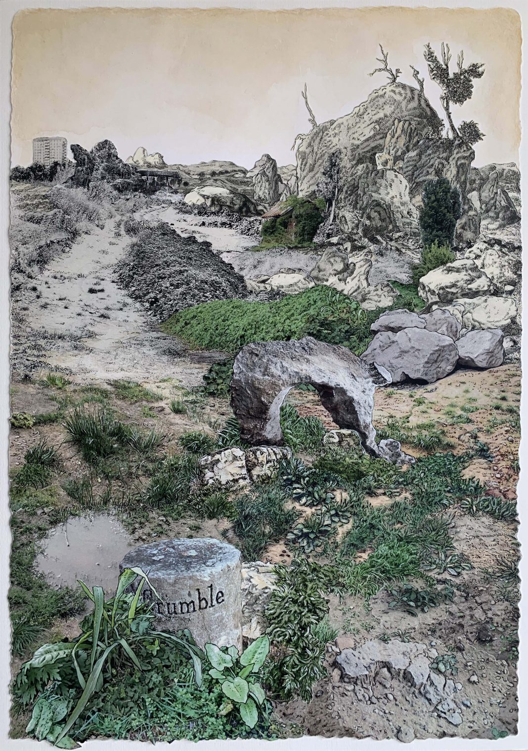 Il paesaggio non offre più direzioni molteplici verso luoghi sicuri; ci obbliga invece a percorrere una sola via, a varcare portali di pietra che non conducono più da nessuna parte, a trovare incisa sui massi la propria profezia - Grandi pietre direzionali/ ma nessun viaggiatore2 - come in Crumble, Blank slate3.