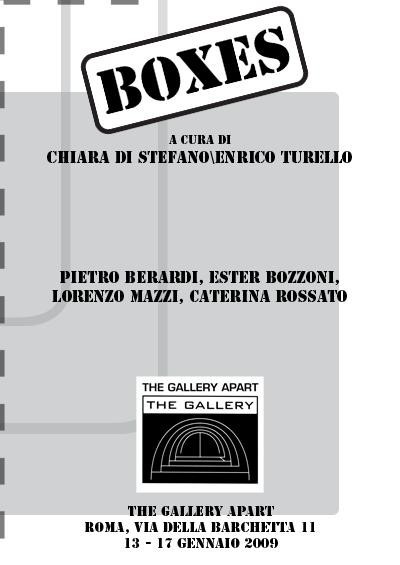 Il progetto espositivo nasce nell’ambito del Laboratorio di Allestimento 1, diretto da Cornelia Lauf in collaborazione con Ilaria Gianni, inserito nel Corso di Laurea in Produzione e Progettazione delle Arti Visive presso la Facoltà Design e Arti dell’Università Iuav (www.iuav.it) di Venezia. Al termine dei corsi si è inteso offrire agli studenti, curatori e artisti, la possibilità di testare la propria creatività, preparazione e talento proponendo una collaborazione ad alcuni spazi espositivi accuratamente selezionati in diverse città italiane cui è stato richiesto di ospitare mostre autogestite dagli stessi studenti. The Gallery Apart (www.thegalleryapart.it), unica galleria romana coinvolta nel progetto patrocinato dalla Fondazione Bevilacqua La Masa di Venezia, ha accolto con entusiasmo la proposta di ospitare la mostra Boxes.