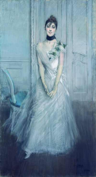 La giovane ragazza, appena diciottenne, era una delle nipoti di Ramòn Subercaseaux, brillante diplomatico, scrittore e pittore dilettante, committente e poi amico di John Singer Sargent, il pittore che aveva introdotto Boldini nella cerchia dei ricchi cileni in viaggio per le capitali d’Europa: ‘bella come un amore’ aveva ammaliato persino l’ormai famosissimo pittore italiano, nel cui studio ambiva posare tutta la buona società europea e ogni sorta di miliardarie americane, appena giunte a Parigi, pronte a svaligiare le case di moda e a tentare l’impossibile pur di avere un ritratto di Boldini da esibire in salotto. Dalle sedute di quella giovane e ancora timida ragazza nell’atelier più in voga del momento, scaturì un capolavoro, premiato all’Esposizione Universale di Parigi del 1889, e in cui la critica contemporanea riconobbe una svolta artistica del Boldini, ormai teso a rappresentare una femminilità suprema ed irresistibile, correttissima e pudica… come evocazione di assoluta purezza d’animo. Il maestro fu consapevole da subito di questo felicissimo risultato, raggiunto grazie anche alla maestria con cui sapeva padroneggiare la tecnica del pastello anche su vaste superfici, degno erede della grande tradizione ritrattistica settecentesca di Raphael Mengs e Rosalba Carriera; perciò non si volle mai privare di quella opera così fragile eppure così ipnotica: essa rimase gelosamente conservata nel suo atelier fino a quando la vedova Emilia Cardona non la donò allo Stato Italiano, che la destinò a Brera.