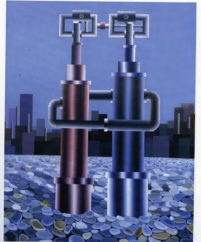 Non mancheranno opere raffiguranti paesaggi industriali e gli autobiografici robot, icone della condizione di esistenza dell’uomo contemporaneo. Composti da cilindri dalla lucentezza metallica e ambientati in paesaggi umani, i robot vanno nelle tele gradualmente scomponendosi in geometrie variabili, in “membrature tubolari” fino ad arrivare alle suggestive scene su ampie massicciate di pietre cangianti che segnano le opere degli anni 2000. E’ nella serie delle massicciate che compaiono le fantasmagoriche Capital Letters, ovvero quelle ” Lettere di maiuscola finezza – afferma Roberto Russo – che si vanno ad impiantare nel mezzo di mari ed oceani immutevoli sopra delicatissime distese di sassolini e pietruzze, levigate tanto dalle acque quanto dalla straordinaria maestria del pennello”. Gli sfondi di impatto tridimensionale caratterizzano la ricerca e la produzione attuale, che raggiunge risultati di grande effetto estetico.