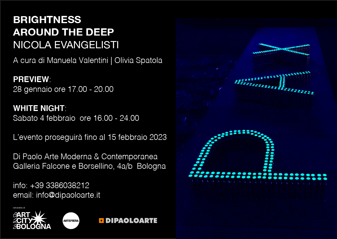 Nell’ambito di ART CITY Bologna 2023 in occasione di ARTEFIERA, la galleria di Paolo Arte presenta il progetto di Nicola Evangelisti intitolato “Brightness – Around the deep”.