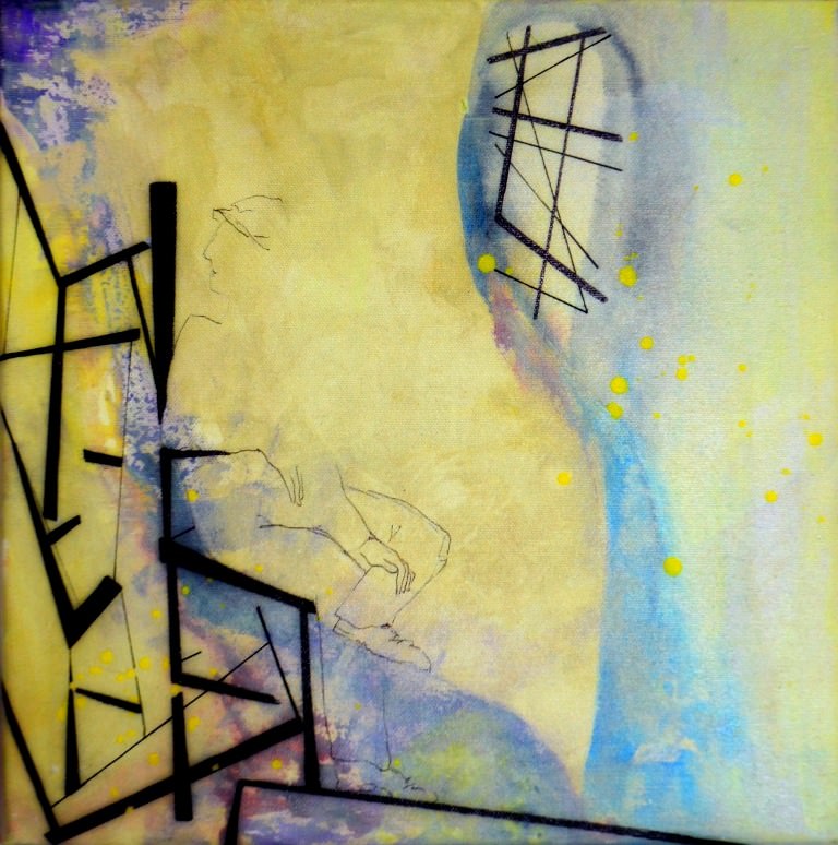 E compare anche in chiave ridotta, in una piccola scultura, assieme alla figura del padre su di essa seduto. Staccata dalla compagine dei quadri, la scultura acquista il ruolo inaspettato dell’osservazione.- l’uomo che osserva è il titolo d questa mostra – spostando sullo sguardo il focus di questa proposizione."