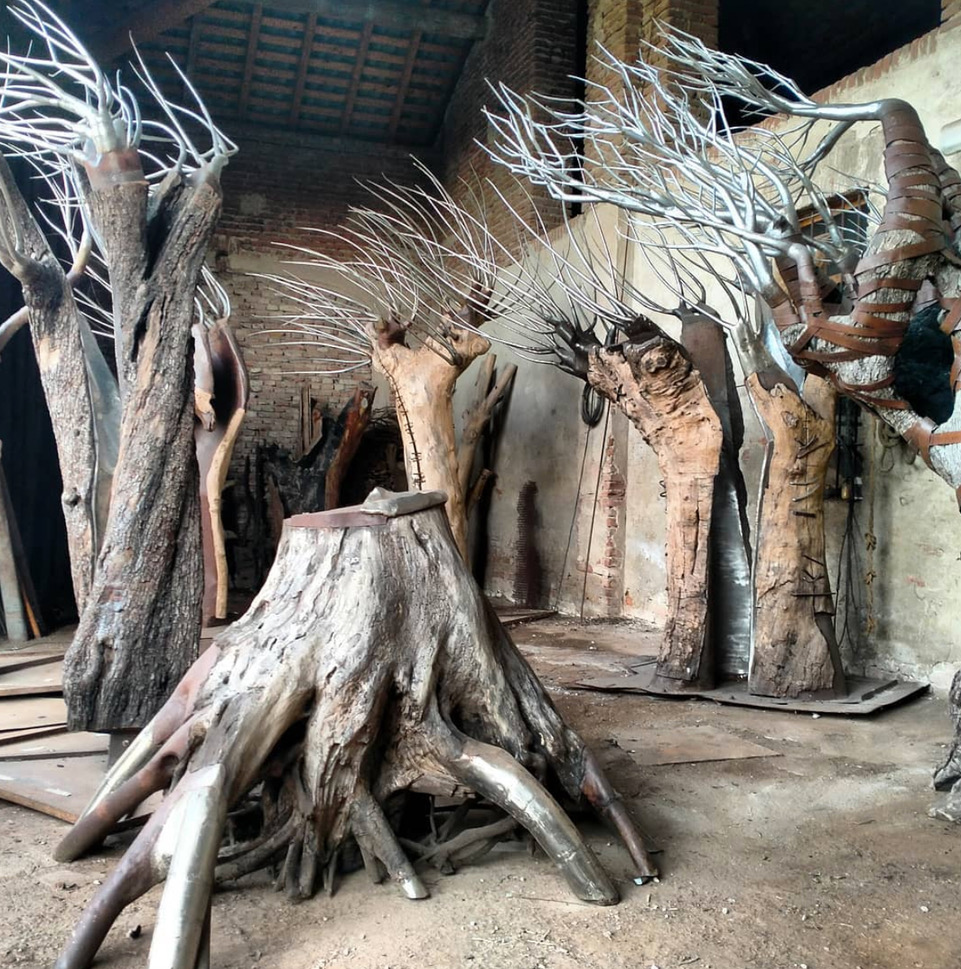 Davanti al Museo BeGo l’installazione “Alberi a nuova vita” racconta il tema del tempo, non interpretato solo come concessione della sua ciclicità cronologica, ma anche descritto nella scoperta del senso della vita che, attraverso la morte, giunge a una rinascita, dove gemme e rami nuovi spuntano nuovamente in un luminoso acciaio inox.
