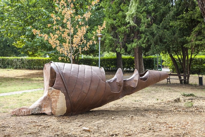 Brunivo Buttarelli, reduce da un’importante mostra al MUSE – Museo delle Scienze Trento, presenta nel parco di Villa Verde “Gasteropode”, una scultura imponente, realizzata nel 2015 in acciaio corten e marmo rosa di Verona. «Un reperto – scrivono le curatrici – emerso da un passato geologico, un “intruso” di non chiara provenienza che si impossessa di un ambiente che non sembrerebbe il suo. L’esistenza stessa di questa creatura, o di ciò che ne rimane, ci porta alla consapevolezza che niente sia immobile: ciò che siamo e conosciamo oggi non è altro se non una situazione transitoria. Dopotutto negli spazi in cui “Gasteropode” si palesa, sotto le lunghe braccia dei pini, una volta c’era il mare…».