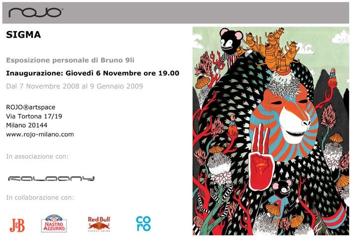 L’esposizione SIGMA (con un site-specific appositamente realizzato per il ROJO®artspace di Milano) è la prima parte di un progetto curatoriale che prevede, esattamente una settimana dopo il 14 Novembre, l’inaugurazione di SUMA, un’altra personale di 9li presso il ROJO®artspace di Copenhagen.