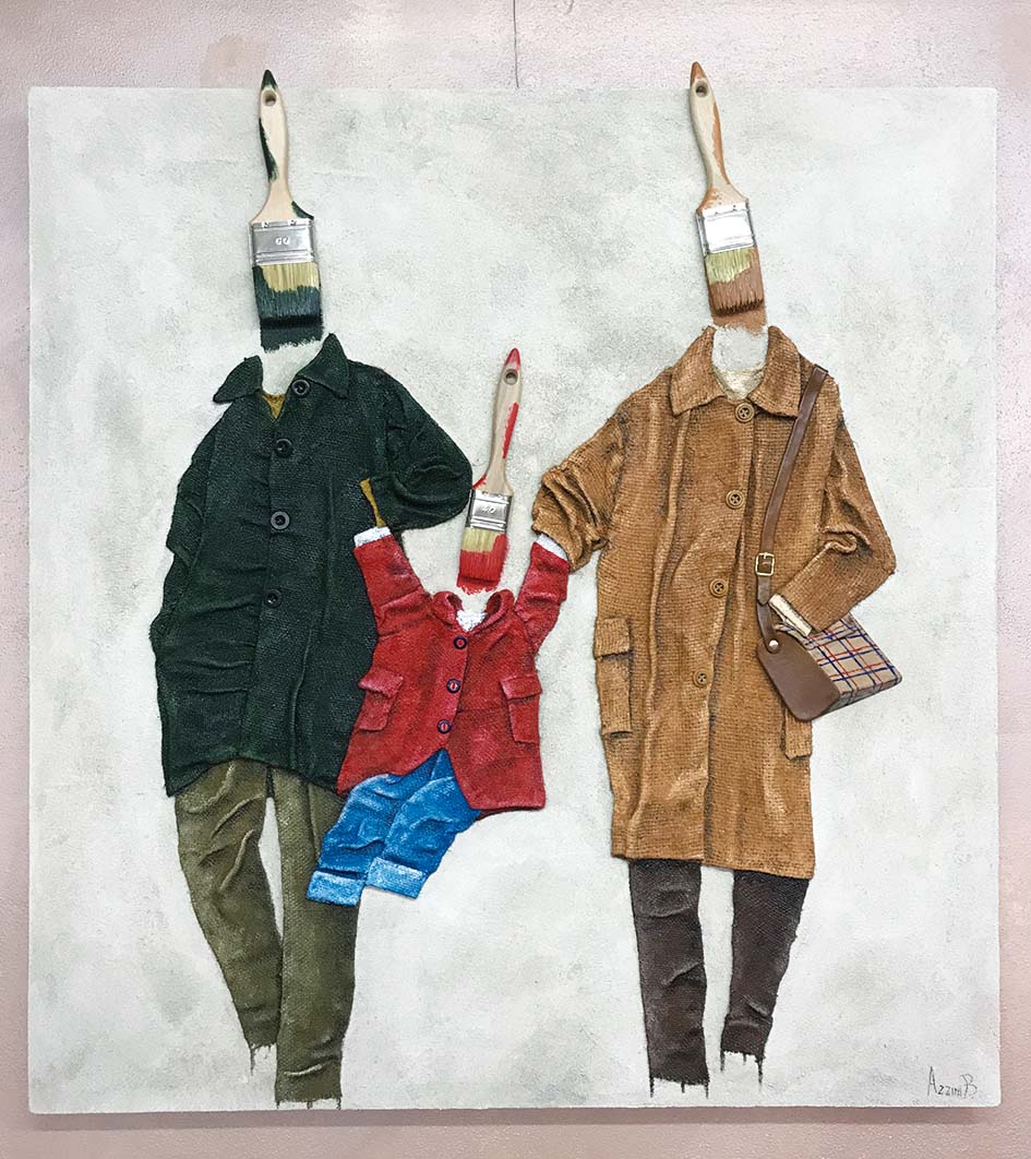 La pittura di Azzini è focalizzata sull’abbigliamento, ogni individuo rappresentato è legato all’immaginazione di chi lo guarda.