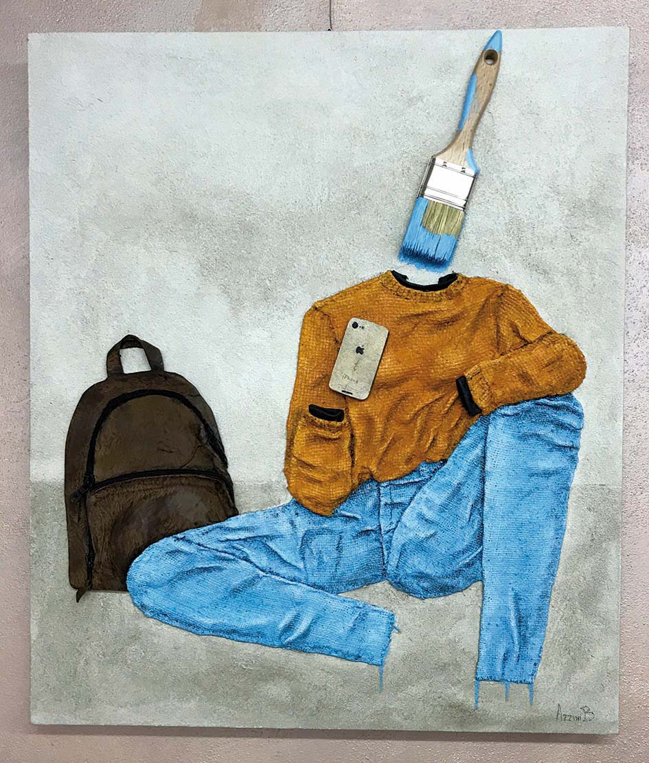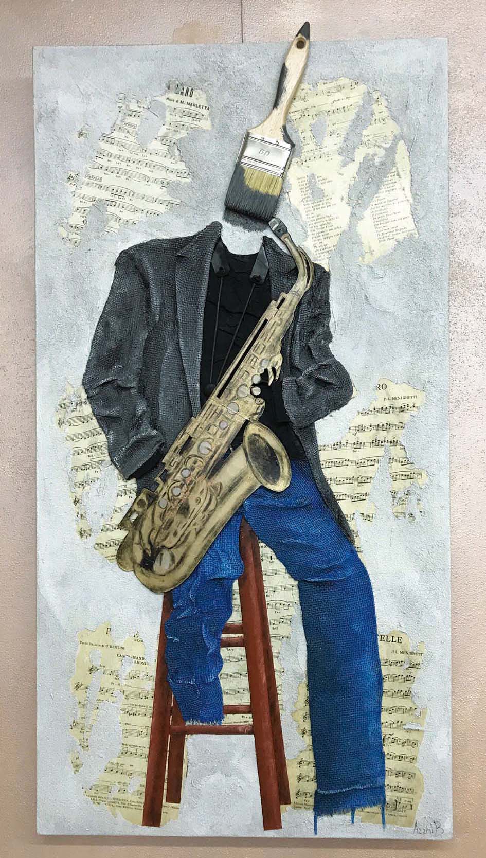 È dall’inizio del 2015 che Bruno definito l’artista del “pennello pieno di sogni” stupisce con la sua originalità sostituendo la testa dei personaggi con un pennello vero e proprio. L’autore piega e ripiega la juta, la tira, la distende, l’assesta, la incolla e poi la dipinge con colori acrilici.