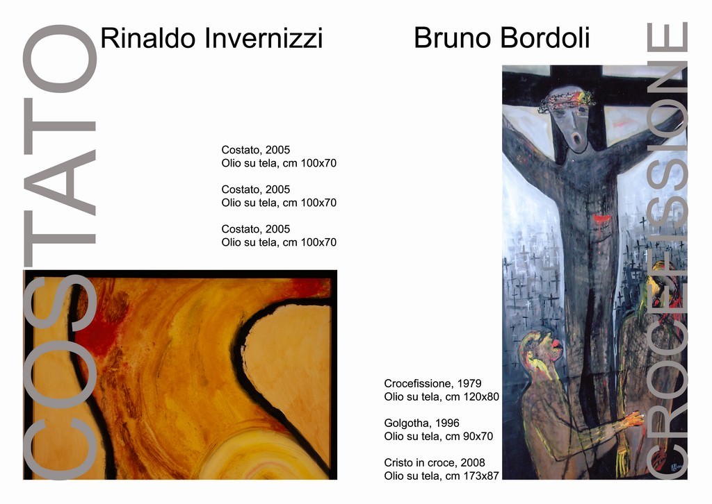 Bruno Bordoli espone tre “Crocefissione “ realizzate nel periodo che va dal 1979 al 2008 : sono opere che ci mettono di fronte al Mistero dell’Uomo del Dolore che è anche il simbolo del dolore, del bisogno di riscatto, di redenzione di ognuno di noi .