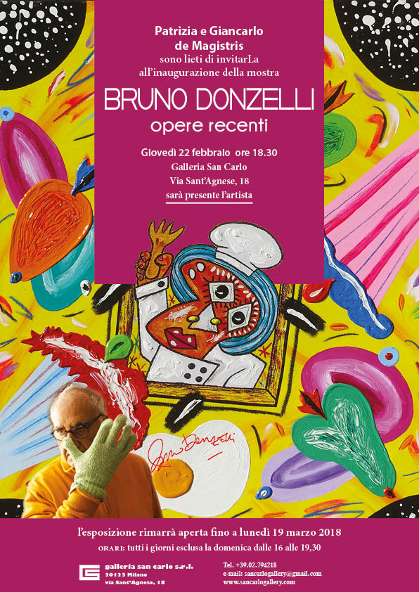 Si inaugurerà giovedì 22 febbraio 2018, alle ore 18:30, la mostra personale di BRUNO DONZELLI alla GALLERIA SAN CARLO, MILANO, Via Sant’Agnese 18. Saranno esposte circa 20 opere realizzate negli ultimi tre anni. In occasione dell’esposizione sarà pubblicato un catalogo con testo di Gérard-Georges Lemaire, oltre un’ampia antologia critica con note di Dorfles, Crispolti, Menna, Lemaire, Caramel, Beringheli, Battarra, Lambertini, Finizio, Sanesi, Apa, Janus, Carboni, Trimarco, Cerritelli, Caprile, Trione, Vivaldi ed altri.