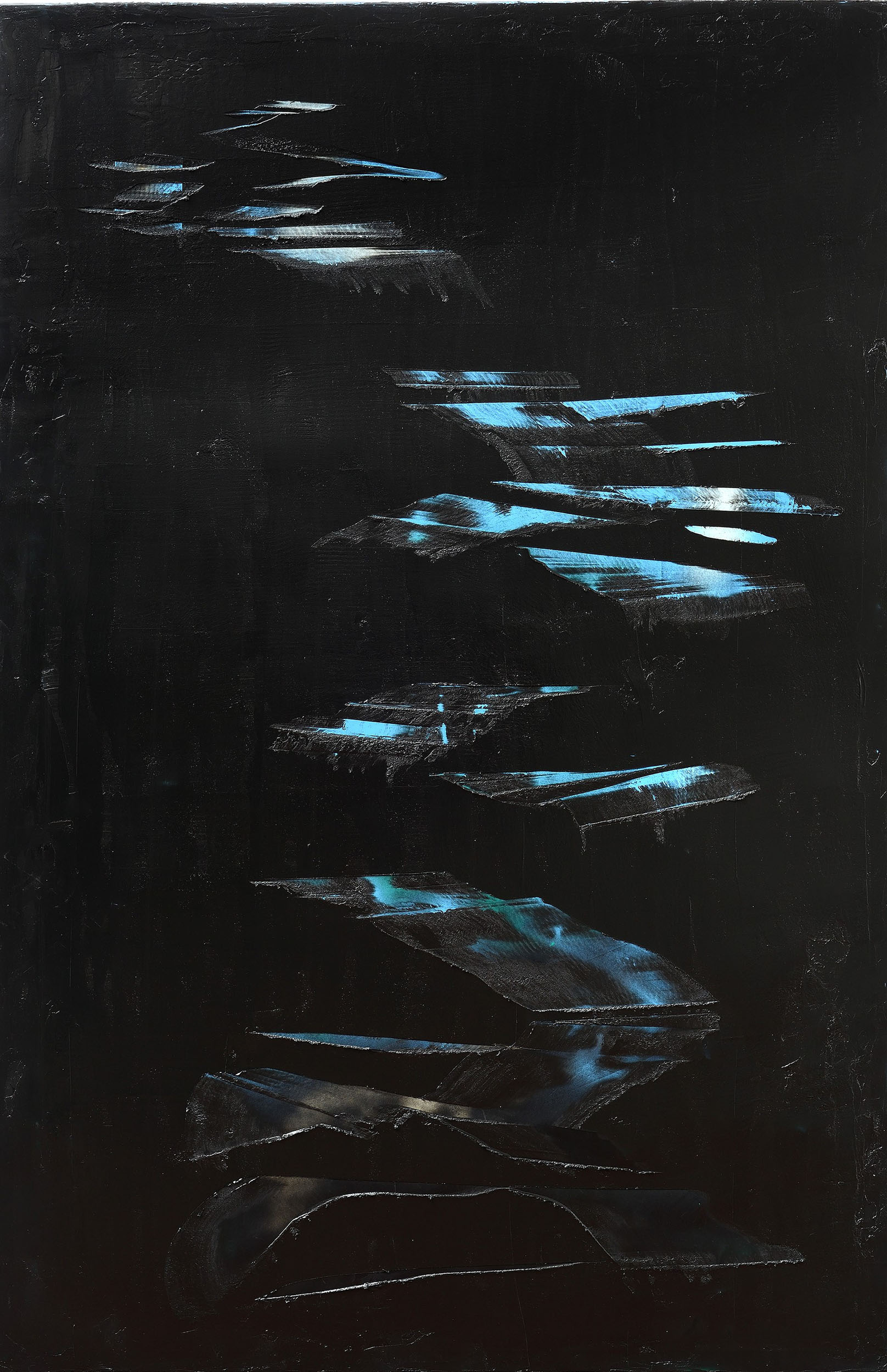 Infine, certi passaggi maturati in primis attorno al perimetro degli Iceberg aprono a quella che recentemente sempre più si va delineando come una serie di opere di un nero assoluto, dalle superfici incise, a tratti increspate, vibranti, come attraversate da un lento ma potente magmatico moto interno. Continua il curatore: “Quando ci si trova dinanzi a tavole frutto dello stesso tema ma apparentemente di un nero siderale, appena l'occhio si abitua a muoversi rapido per cercare in questo caso le incisioni dei gesti pittorici, la superficie si dilata verso le profondità degli abissi primordiali: lasciandosi risucchiare, abbandonandosi, ci si addentra di un altro passo negli spazi infiniti della psiche”.