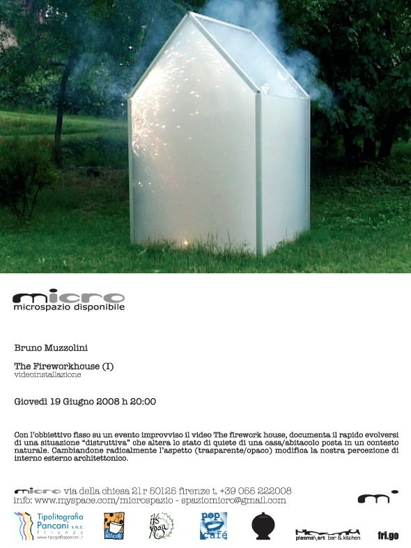 Con l’obbiettivo fisso su un evento improvviso il video “The firework house” di Bruno Muzzolini, documenta il rapido evolversi di una situazione “distruttiva” che altera lo stato di quiete di una casa/abitacolo posta in un contesto naturale.