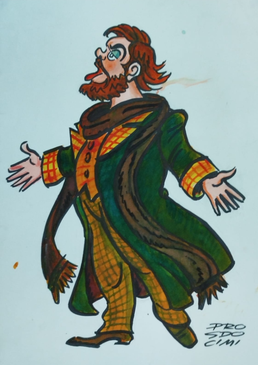 Siamo intorno agli anni ’70 quando con il lasciapassare dell’allora sovrintendente Carlo Alberto Cappelli poteva vedere da vicino tutto quello che precedeva l’entrata in scena di orchestrali, direttori, ballerini e cantanti, poteva quasi condividerne le emozioni, di certo ne ammirava la grande determinazione e preparazione e poi arrivava il momento fatidico dell’inizio dello spettacolo che stemperava ansie e paure nella piena certezza che tutto sarebbe andato bene. Negli anni i disegni di Prosdocimi sono stati protagonisti di coloratissime mostre visitate proprio dai diretti interessati ma anche da tanto pubblico, perchè proposta così, la lirica diventava divertente. Mai dissacrante e sempre celebrativa la sua caricatura richiamava l’attenzione e l’interesse di tanta gente…Senza saperlo il disegnatore stava facendo una vera e propria operazione culturale, era riuscito nell’intento di far avvicinare alla lirica anche i meno avvezzi alla frequentazione dei teatri d’opera, vincendo sulla credenza che questo fosse uno spettacolo di nicchia. Della stessa opinione era Gigi Vesigna, direttore del settimanale “Sorrisi e Canzoni TV”, Vesigna che conosceva Prosdocimi lo contattò per affidargli un incarico molto particolare, il disegnatore avrebbe dovuto raccontare per immagini la storia del Teatro La Scala di Milano per celebrarne i 200 anni, decisione quasi coraggiosa da parte di Vesigna dato che il tema esulava da quelli di solito trattati dalla rivista, ma sulla scia di qualche cambiamento che era nell’aria pensò che Prosdocimi sarebbe stata la persona giusta per proporlo, era il 1977 e per la prima volta su “Sorrisi e Canzoni TV” apparve la lirica. Con un pizzico di orgoglio a riprova della lungimiranza di Prosdocimi possiamo riferire che i tre numeri del settimanale uscirono con l’orgogliosa fascetta rossa che riportava l’alto numero di copie vendute.