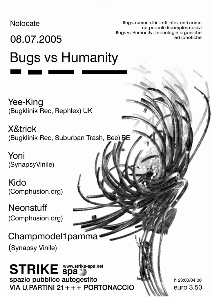 Nell’ambito delle innumerevoli etichette indipendenti europee la belga Bugklinik si propone come una delle più interessate alla sperimentazione di beat selvaggi e atmosfere melodiche. Una sorta di ponte ideale tra le etichette storiche degli anni novanta e gli artisti del nuovo millennio. Reminiscenze IDM si fondono assieme alle frenesie digitali della Breakcore creando un impatto devastante. Nata in Belgio nel 2004 e legata ad etichette come la Rephlex e la Planet Mu, il progetto è legato a doppio filo a quello dei connazionali del collettivo Comphusion, gruppo di musicisti indipendenti impegnato in live-set tra il nord europa e in Italia grazie al lavoro di altre produzioni indipendenti come Synapsy Vinile e Stirpe 999. Obiettivo della serata è proporre un evento che sia capace di coinvolgere il maggior numero possibile di persone interessate ad un approccio all’arte e alla musica non mediato da problemi di distribuzione e di copyright e che credono nella libera circolazione di persone, progetti e musica. Per questi motivi la scelta di un posto come lo Strike, da sempre impegnato a proposte musicali, e non solo, rigorosamente al di fuori dei canali commerciali mainstream, può essere l’occasione perfetta per unire un evento di qualità elevata senza alcuna mediazione istituzionale, di moda o di genuflessione a qualsivoglia presunto hype postmoderno...