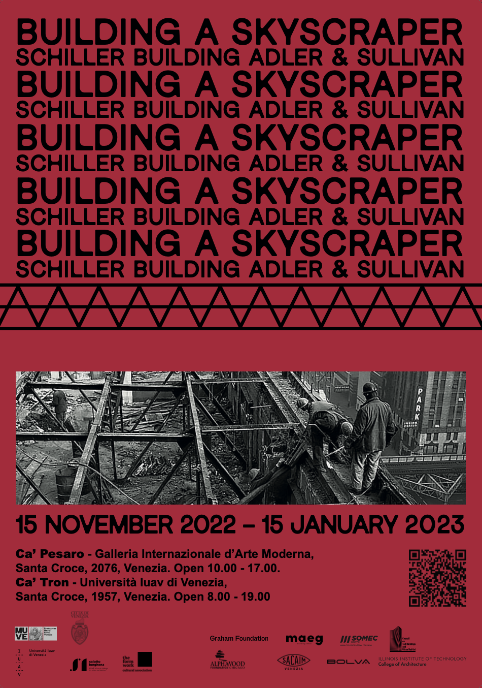 La mostra espone il lavoro degli studenti e docenti IUAV sullo Schiller building (demolito nel 1961), edificio del 1891 di Adler&Sullivan. Grazie ai materiali esposti il grattacielo rivive mostrando l’inedito accostamento fra complesso congegno strutturale e raffinate decorazioni in terracotta.