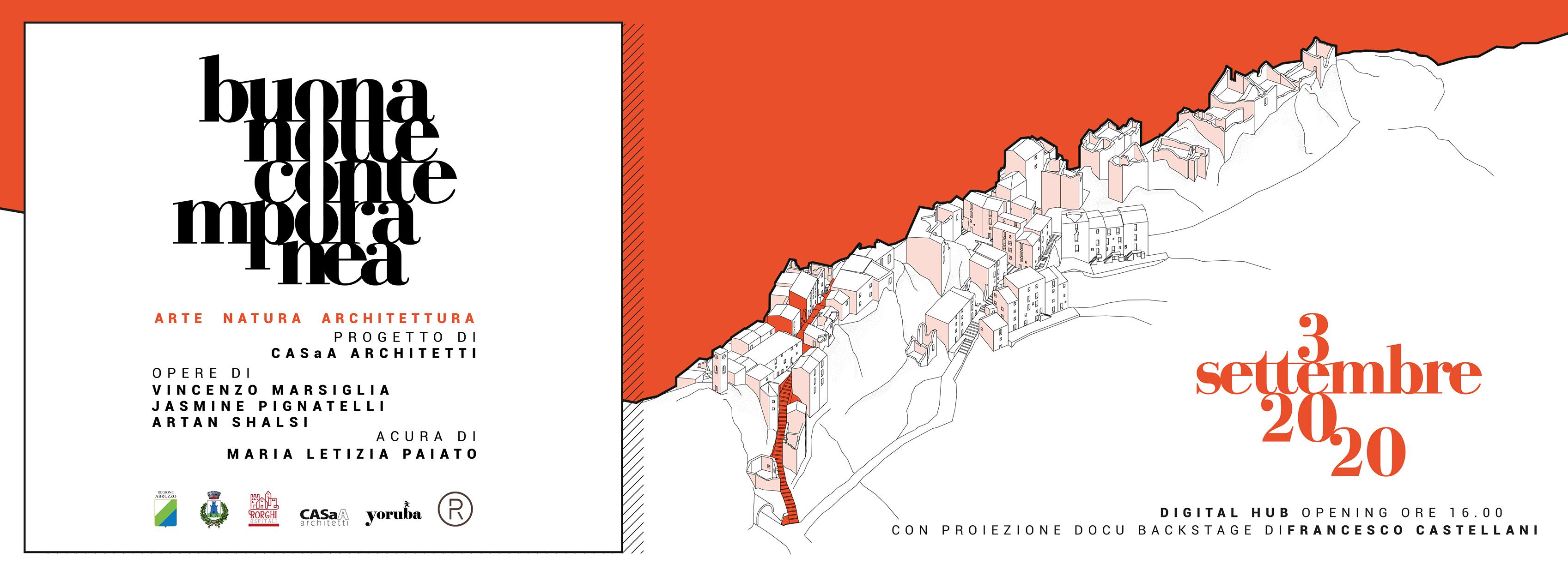 Promosso dal Comune di Montebello Sul Sangro (CH) e realizzato con il sostegno di Regione Abruzzo, Buonanotte Contemporanea è un progetto inedito e interdisciplinare ideato da CASaA architetti (Fabio Armillotta, Carmela Palmieri e N. Marco Santomauro) per la valorizzazione e lo sviluppo turistico strategico integrato e sostenibile del vecchio borgo di Buonanotte. Nel piccolo centro arroccato su una sella rocciosa tra la Maiella e il lago di Bomba – oggi totalmente abbandonato a causa di un sistema di frane iniziato negli anni Sessanta – arte, natura e architettura convergono in un unico lavoro in grado di dare origine a percorsi creativi condivisi, dove il patrimonio edilizio tradizionale abruzzese si intreccia all’ambiente naturale e alle relazioni culturali, che affidano all’arte il futuro dell’esistenza umana. A Buonanotte, gli interventi degli artisti Vincenzo Marsiglia, Jasmine Pignatelli e Artan Shalsi, a cura di Maria Letizia Paiato, dialogano con i ruderi del borgo, con il logorio del tempo e con la surreale assenza della figura umana, per concorrere alla realizzazione di un percorso sperimentale, poetico e sicuro, in cui la ricerca artistica risponde in modo strutturale alle esigenze architettoniche di consolidamento del borgo.