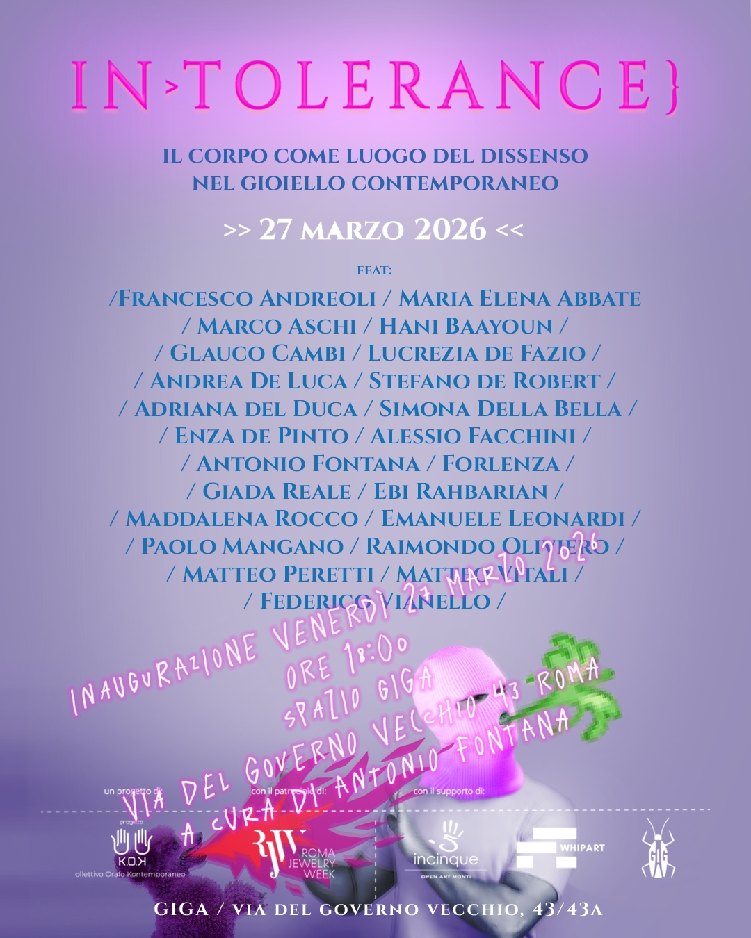 Studio G.I.G.A. ospita Intolerance, mostra collettiva che affronta i temi del limite, dell’incompatibilità, dell’intolleranza e della tensione attraverso il gioiello contemporaneo e l’installazione corporea. Il progetto mette al centro il corpo come spazio di relazione e confronto, e indaga come la materia, una volta indossata, possa modificare la percezione e ridefinire il rapporto tra oggetto e soggetto.