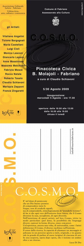 Mercoledì 5 agosto, alle ore 17.30 nello scenario della Pinacoteca Civica B. Molatoli a Fabriano, sarà inaugurata C.O.S.M.O., mostra collettiva di opere estemporanee, a cura di Claudio Schiavoni.