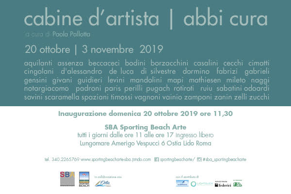 SBA – Sporting Beach Arte è uno spazio che accoglie l’arte contemporanea all’interno di uno stabilimento balneare, lo Sporting Beach, a Ostia; non solo una galleria, ma un luogo d’incontro per comprendere insieme le diverse problematiche dell’ambiente naturale e sociale in cui è inserito. Proprio in questo che è uno degli ultimi stabilimenti storici del litorale romano, dal 20 ottobre al 3 novembre 2019 sarà ospitata la mostra “Cabine d’Artista – Abbi Cura” a cura di Paola Pallotta e promossa da SBA – Sporting Beach Arte.