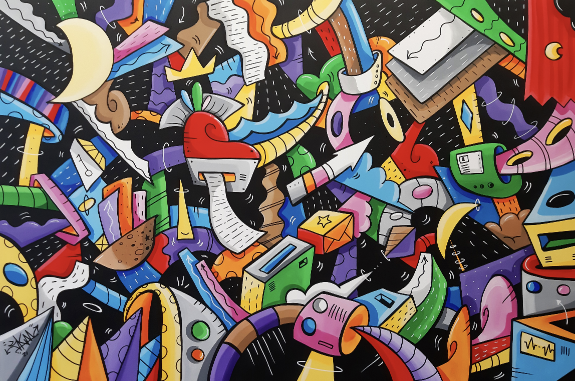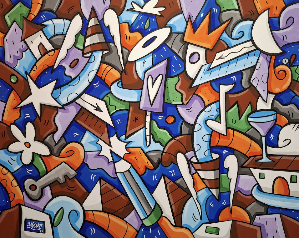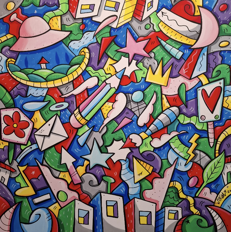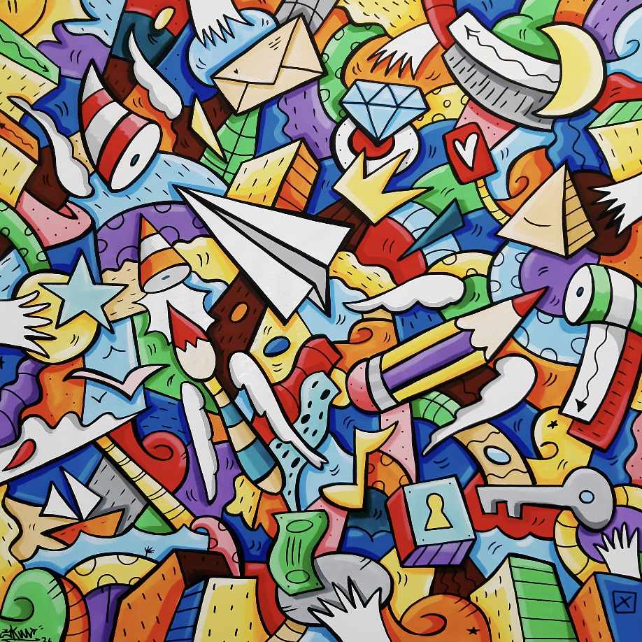CaleidoSkim è un viaggio dentro l’universo visivo di Skim, dove colore, forma e movimento si intrecciano in un equilibrio sorprendente. Come in un caleidoscopio, le sue opere moltiplicano frammenti di realtà in composizioni dinamiche e oniriche, dense di dettagli da scoprire.