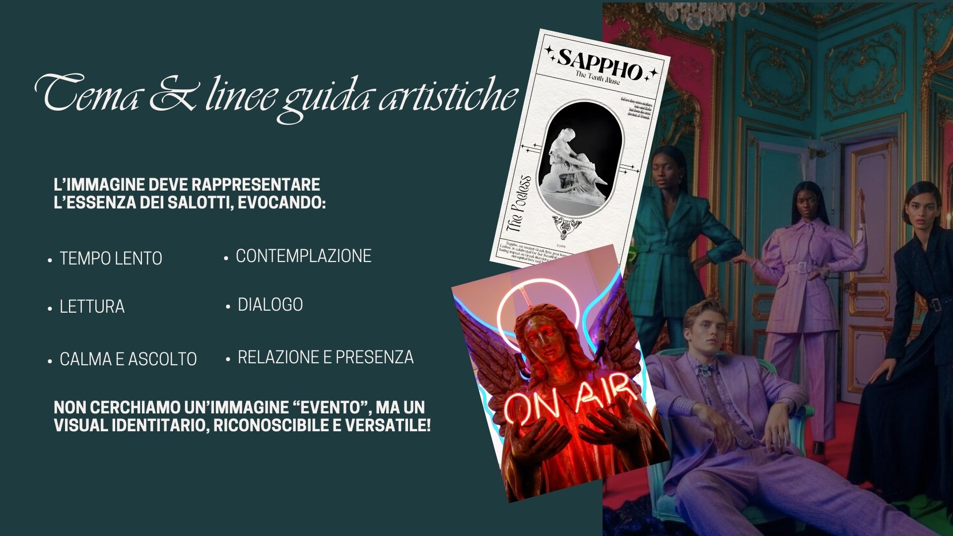 La ricerca punta a un’opera capace di restituire l’identità dei Salotti delle Muse: uno spazio di incontro, ascolto e immaginazione condivisa. L’artwork dovrà essere riconoscibile, evocativo e in grado di tradurre in forma visiva l’atmosfera intima e partecipativa che caratterizza il progetto.