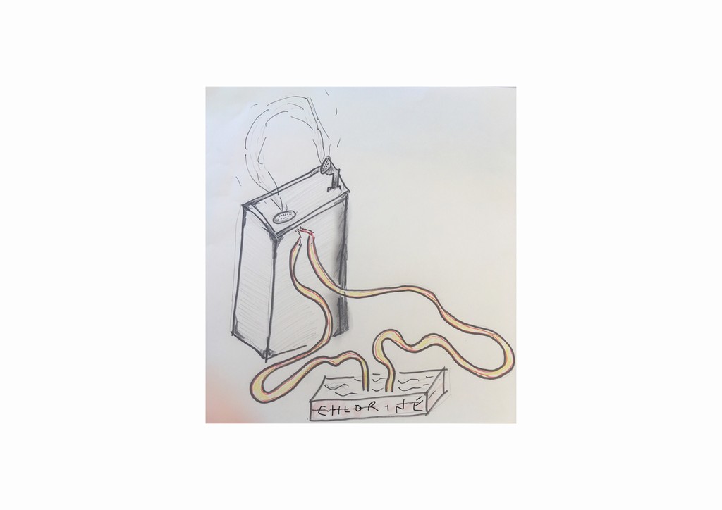 In Everything Might Spill, 2018, un disegno a parete che reca l’immagine ingigantita di un organo umano è messo in relazione a una fontana dalla quale sgorga un liquido dichiaratamente tossico. L’installazione può essere interpretata come un’inquietante riflessione sulla condizione umana, soggetta a una crescente ed ossessiva dipendenza dalla tecnologia, al punto di avviarsi verso mutazioni incontrollabili e non reversibili.