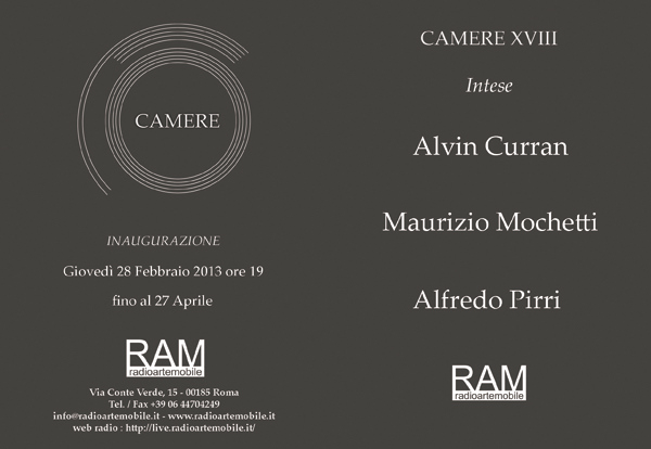 Dopo due mostre Promemoria, RAM riprende il ciclo di Camere con un’edizione tutta romana: Alvin Curran, Maurizio Mochetti e Alfredo Pirri partecipano al 18° appuntamento.