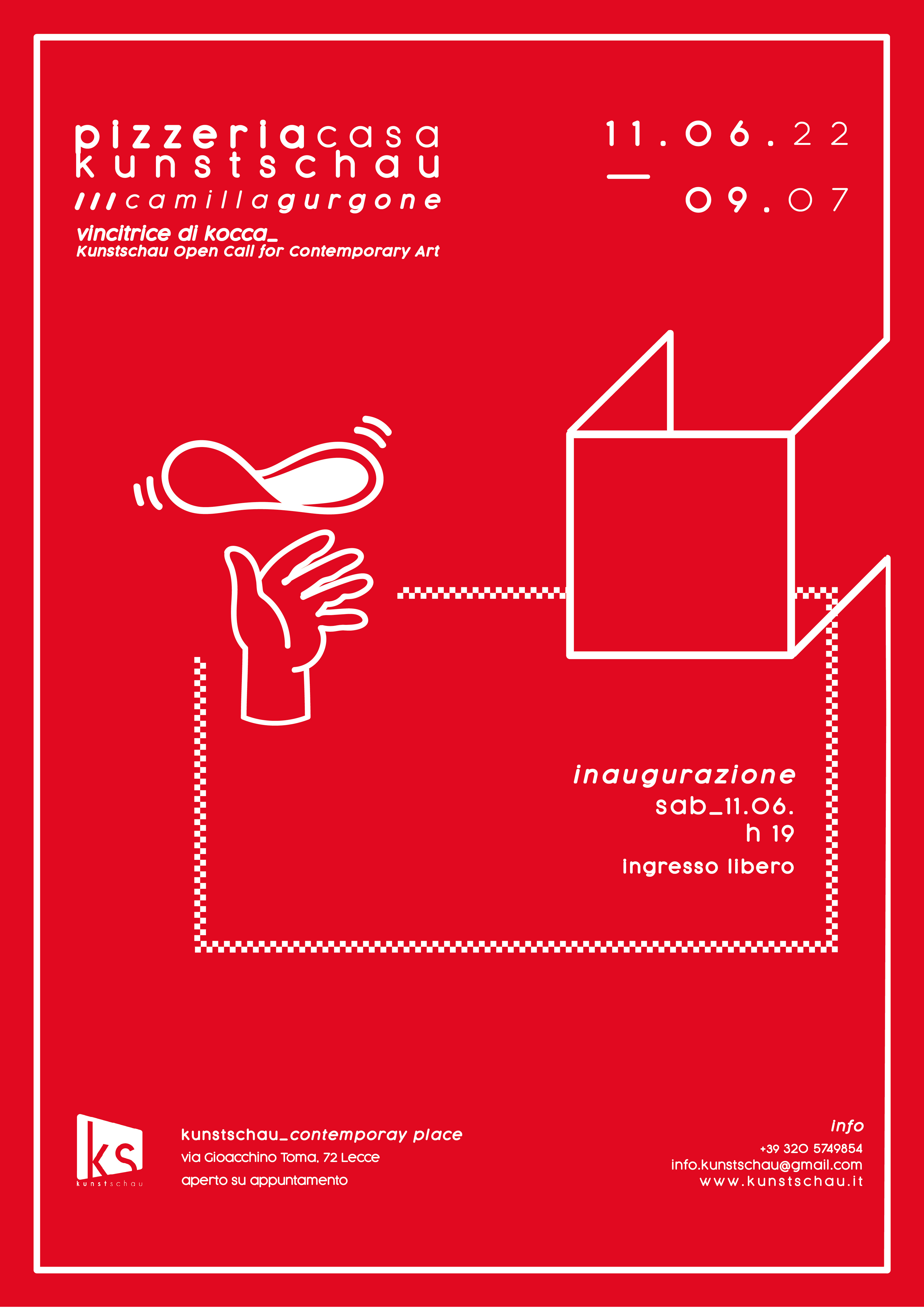 Sabato 11 giugno 2022, alle ore 19.00, Kunstschau_Contemporary Place a Lecce, inaugura la mostra Pizzeria casa Kunstschau, installazione ambientale di Camilla Gurgone (Lucca,1997), vincitrice della prima edizione di Kocca - Kunstschau Open Call for Contemporary Art.