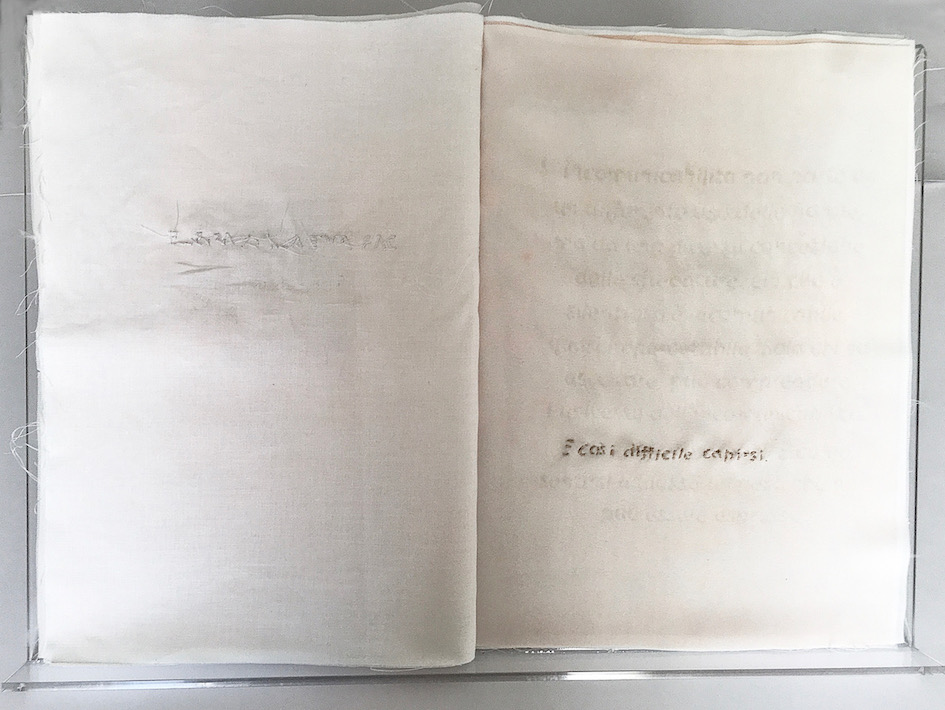 Natalia Lenini con il suo libro ricamato bianco su bianco, lavora sul concetto di comunicazione, sulla difficoltà del linguaggio, ecco che le parole “scritte” cucite addosso come un segno indelebile rivelano tutta la loro fragilità e delicatezza: è proprio difficile comunicare…