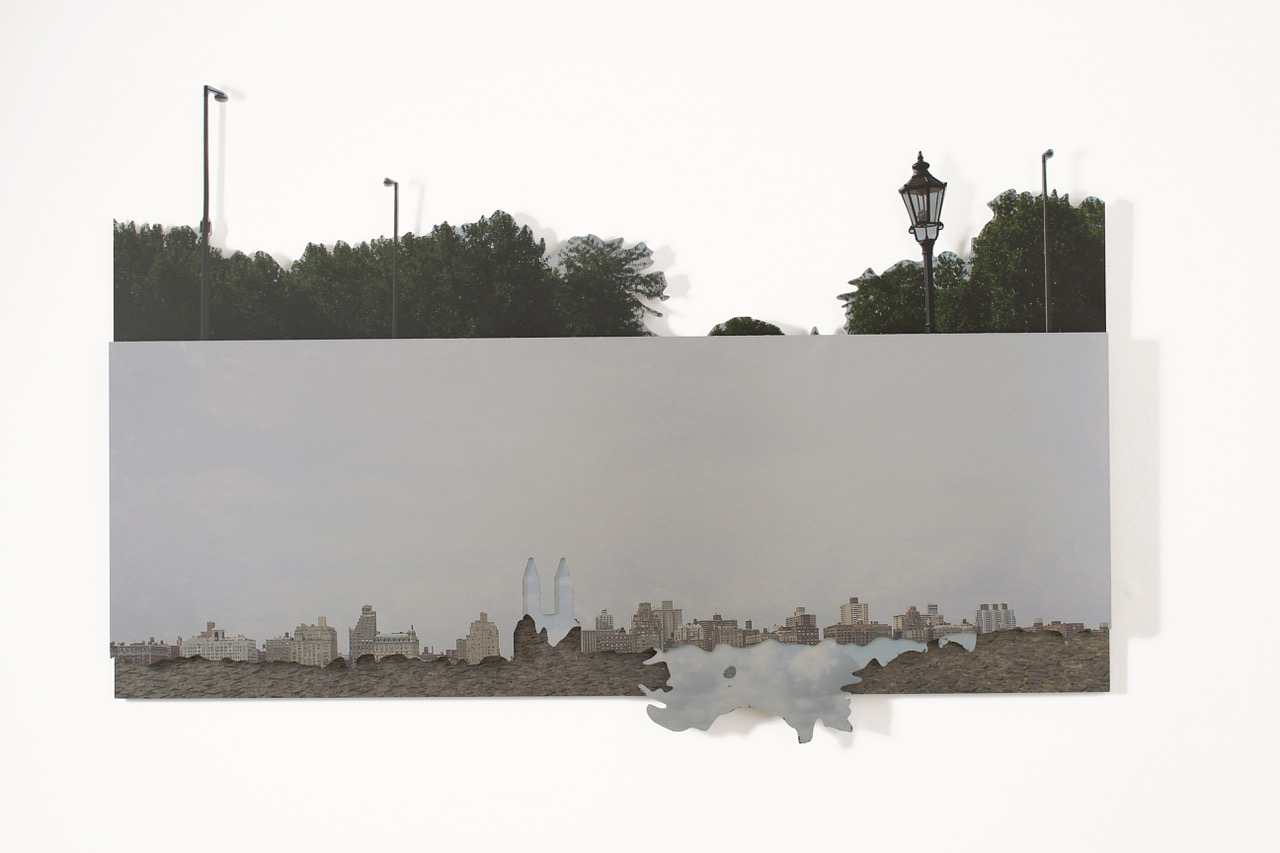 Simona Uberto rimodella il paesaggio, invertendone i valori prospettici: sezionandolo, frammentandolo, per poi ricomporlo in una nuova visione su piani differenti, ricreando un’immagine nata dalla visione del reale, ma divenuta fantastica. Un paesaggio immaginario e sorprendente dove tutto non torna e lo sguardo rimbalza.